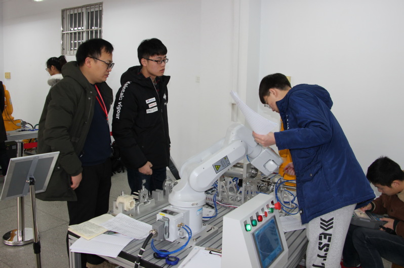 本次大赛吸引了来自合肥工业大学、安徽理工大学、安徽农业大学、安徽建筑大学等10余所高校的157支队伍报名参加。经过初赛,筛选出47支参赛队伍参加决赛。决赛内容为双机器人协同作业完成滚动轴承装配,每队由2-3名选手组成,要求选手在规定时间内完成PLC与两台机器人间通讯建立、I/O口分配、电气连接,PLC和机器人程序编写与调试以及机器人动作示教工作,重点考察选手组建机器人协同作业系统的综合能力,以及机械、电气、气动和控制的综合装配和调试技能。经过激烈角逐,最终有15支代表队获得一等奖,29支代表队获得二等奖。