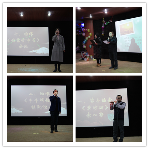 精彩的笛子独奏《紫竹调》拉开了联欢会文艺表演的序幕。老师们各显其能,大展才艺,节目内容丰富多彩。有歌曲演唱《千千厥歌》、《我爱你中国》、《祈祷》和《隐形的翅膀》、也有诗词朗诵《我愿意是激流》、杂技表演《花样毽子》和精彩的魔术表演。舞蹈《绒花》《扇子舞》展现了女教师们曼妙的身姿,将现场气氛推向高潮。互动游戏更是让大家兴致高涨、嗨翻全场。精彩的节目演出在悠扬的笛子独奏《映山红》中结束。