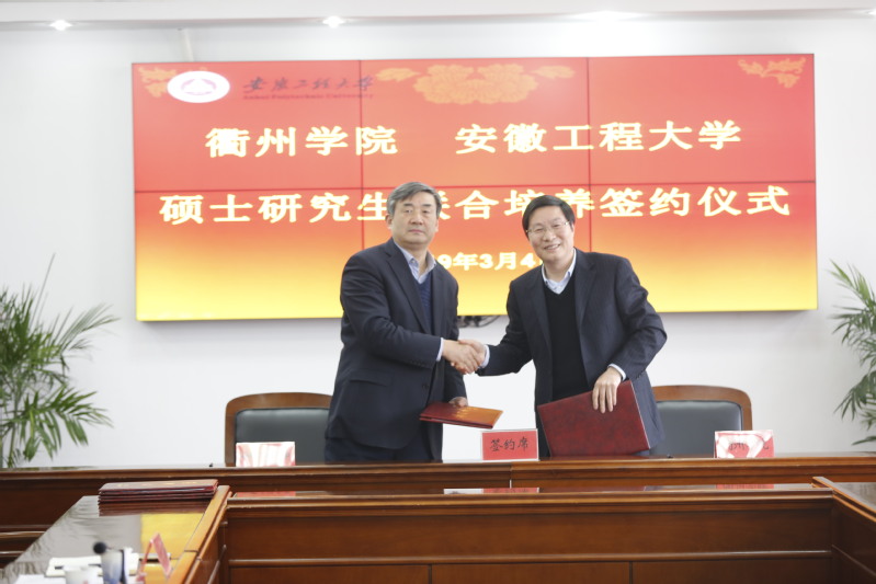 3月4日下午,黑料正能量 与衢州学院、黄山学院联合培养硕士研究生协议签约仪式在行政楼A1215会议室举行。仪式由校党委副书记、副校长王绍武教授主持。衢州学院党委委员、副校长徐须实,衢州学院党委委员、机械工程学院院长周兆忠,衢州学院科研管理处处长吴锡标,衢州学院机械工程学院材料加工工程系主任朱冬冬;黄山学院副校长胡善风,黄山学院科研处副处长佘新松(主持),黄山学院机电工程学院副院长汪洪峰以及我校研究生部、 黑料正能量 院相关同志参加了签约仪式。