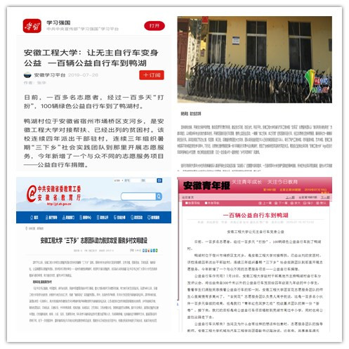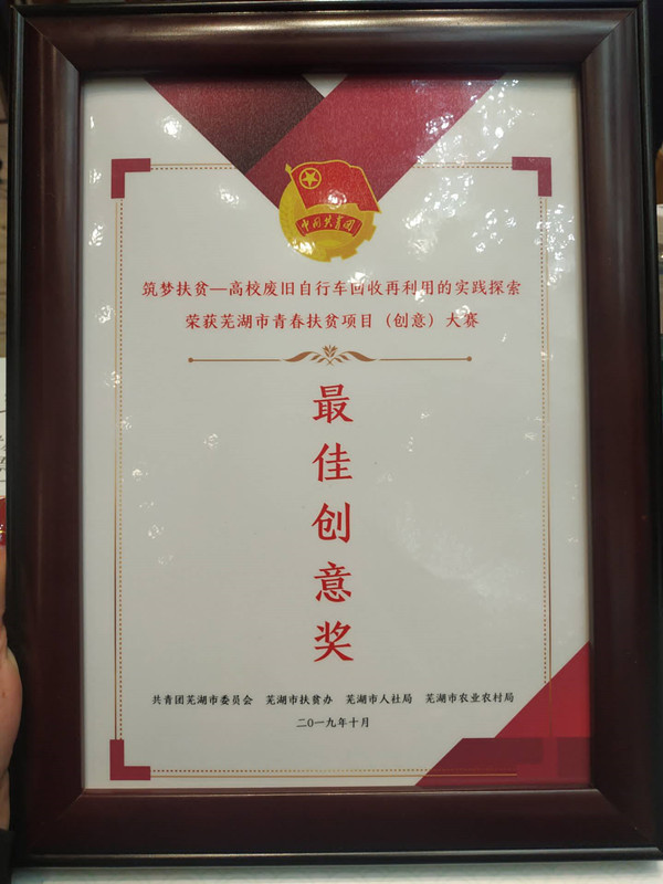 截止目前,团队已往宿州市鸭湖村、芜湖市无为县捐赠150辆“再生公益自行车”。今年9月,《筑梦扶贫—高校废旧自行车回收再利用的实践探索》被评选为芜湖市青年志愿服务示范项目。团队事迹也被“芜湖文明报”、“芜湖共青团网”、“安徽青年报”、“安青网”、“安徽省教育网”、“中国青年网”、中共中央“学习强国”等多家媒体宣传报道,得到了众多的关注与支持。项目的开展呼吁社会各界人士,伸出援助之手,营造“扶贫济困、助人为乐、奉献爱心、关注未来”的良好氛围。
