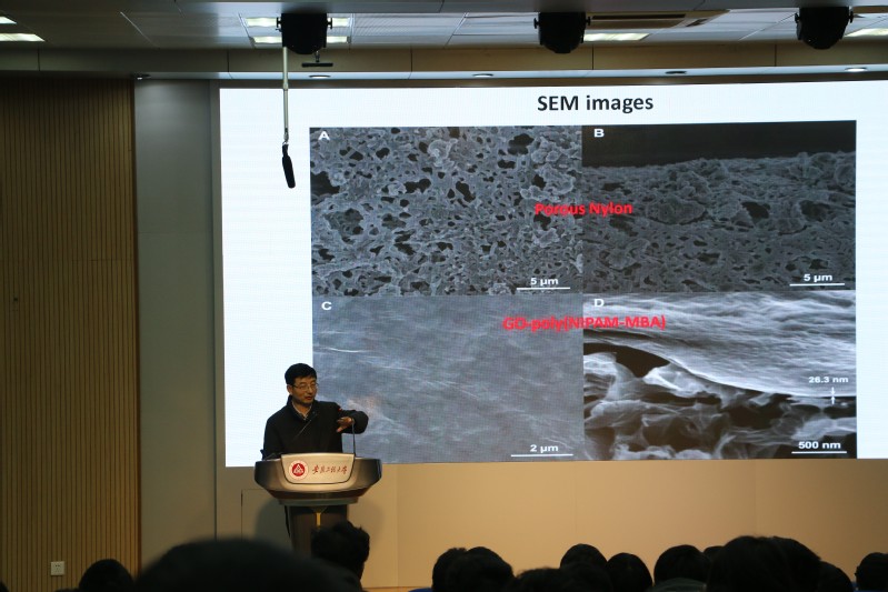 报告会上,王教授首先给广大师生介绍了膜分离的基本原理、现状及应用前景。然后围绕“金属骨架基膜在离子和手性分离中的应用”这一主题,介绍了其课题组近年来在MOF及石墨烯基膜的设计制备以及在金属离子和手性分离方面的应用,并深入研究了影响各种气相和液相分离膜及渗透膜的分离效率的因素,阐述了其分离机制,展望了膜分离领域未来的重点研究方向。报告尾声,王教授与师生就相关膜分离的学术问题及学生的国际交流问题进行了深入的交流和探讨。会后,王焕庭教授就刘琪教授主持的国际合作项目工作给予了充分指导,并指出了后续研究的重点方向。