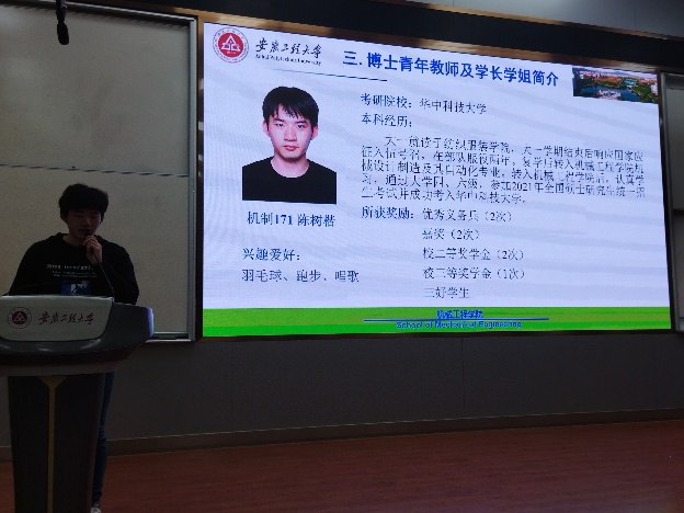 汪爽、程晓亮、王淮阳三位博士青年教师做了生动有趣的报告。汪爽分享了自己读研的经历,包括研究方向、实验室情况、学术交流和读研感悟,并从课程学习、英语学习和学科竞赛等方面,给同学们提出了宝贵建议,鼓励同学们好好学习,丰富自己的能力。程晓亮从时代背景和专业现状出发,指出国家对机制专业高端人才的迫切需求,勉励大家坚定专业理想,打好专业基础,并为同学们提出了有建设性和操作性的学习方法建议,希望大学生树立正确的成才观和幸福观,以积极阳光的心态投入到学习过程中。王淮阳指出,随着中国科技的快速发展,中国机械装备的技术含量会越来越高,为了能够满足未来人才的需求,时代召唤同学们在大学期间应努力奋斗,不断进取,希望同学们在学习和研究过程中,学会在失败中成长,做到“胜不骄,败不馁”,把每一步的成功或失败都看作为迈向更加美好未来的阶梯。