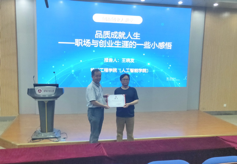 6月2日,机械工程学院邀请1985级机制专业校友,现任铜陵市万达设备制造有限公司总经理王晓友回母校交流并做创业报告。报告会在5J117报告厅举行,学院党委书记伊长文出席报告会,2019级和2020级部分学生参加了报告会。报告会由学院党委副书记李文江主持。报告会开始前,伊长文为王晓友颁发了机械工程学院大学生创新创业导师聘书。