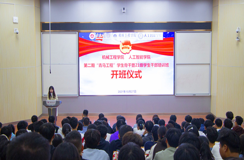 为加强对青年大学生的思想政治引领,加强学院入团积极分子培养和学生骨干队伍建设,10月27日晚,机械工程学院(人工智能学院)第二期“青马工程”学生骨干暨2021级学生干部培训班开班仪式在2教报告厅举行。学院党委书记伊长文、党委副书记何志恒出席开班仪式,学院有关辅导员和培训班全体学员参加。开班仪式由培训班班主任时慕天主持。