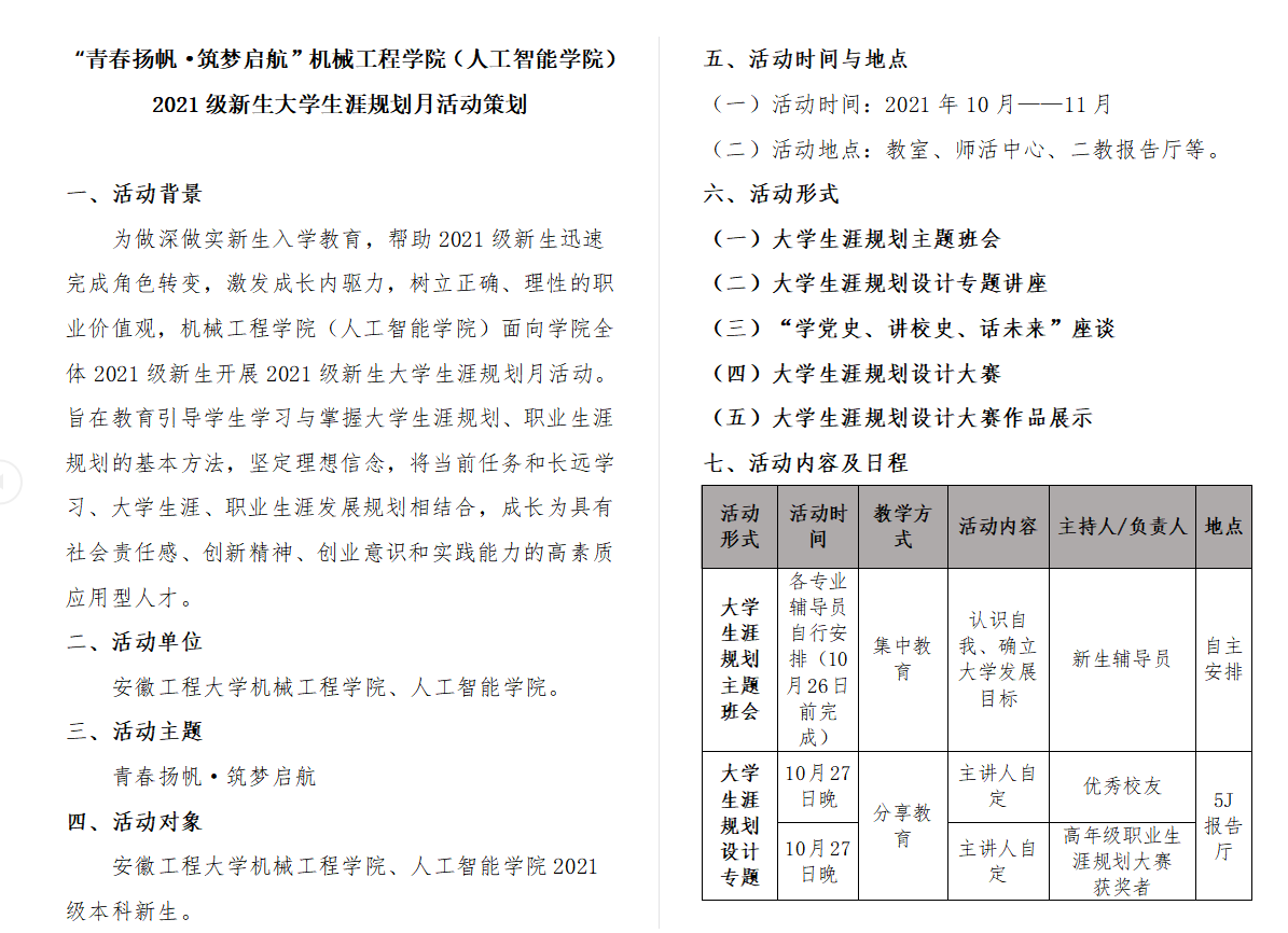 为做深做实新生入学教育,帮助2021级新生增强大学生涯规划意识,明晰发展方向,树立正确的专业观、职业观、就业观。机械工程学院(人工智能学院)坚持“三心”原则,面向学院全体2021级新生开展大学生涯规划系列教育活动,旨在教育引导学生坚定理想信念,将当前任务和长远学习、职业生涯发展规划相结合,成长为堪当民族复兴大任的时代新人。