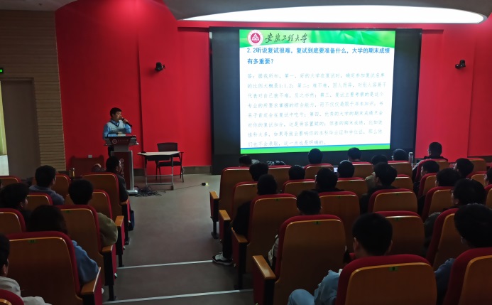 紧接着青年教师王风涛从专业知识准备、面试技巧、心理调适和院校调剂等方面为同学们做了周到详尽的讲解,并强调了几点,一是复试一定要坚持到底、调剂一定要多方面搜集信息;二是扎实的专业课功底,良好的英语口语和表达能力是顺利通过面试的前提;三是复试准备过程中一定要兼顾毕业设计。