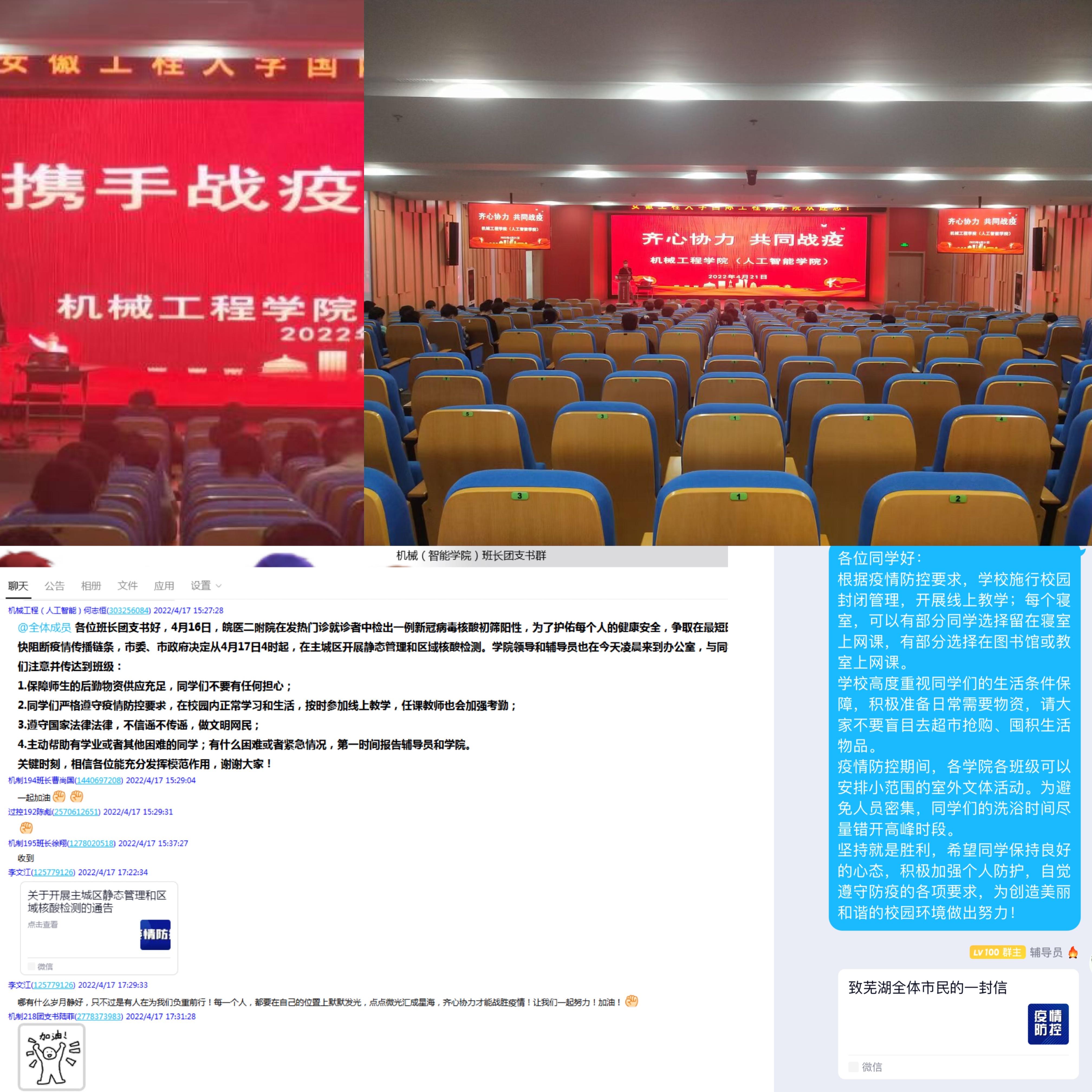 为进一步加强在校学生管理,确保学生在校园内的安全,学院第一时间召开学生党员代表、学生干部代表、学生代表等学生骨干思想动态调研会,会上重点通报了芜湖市疫情防控情况,传达了芜湖市和学校有关会议精神,结合校园疫情防控要求以及学生干部岗位职责,对全体学生骨干做出要求、明确责任、强化担当。会上还认真调研了解了学生在校园封闭管理状态下学习、生活等方面存在的困难,持续加强与相关部门的沟通与交流,反馈学生需求,想学生所想,解学生所难。