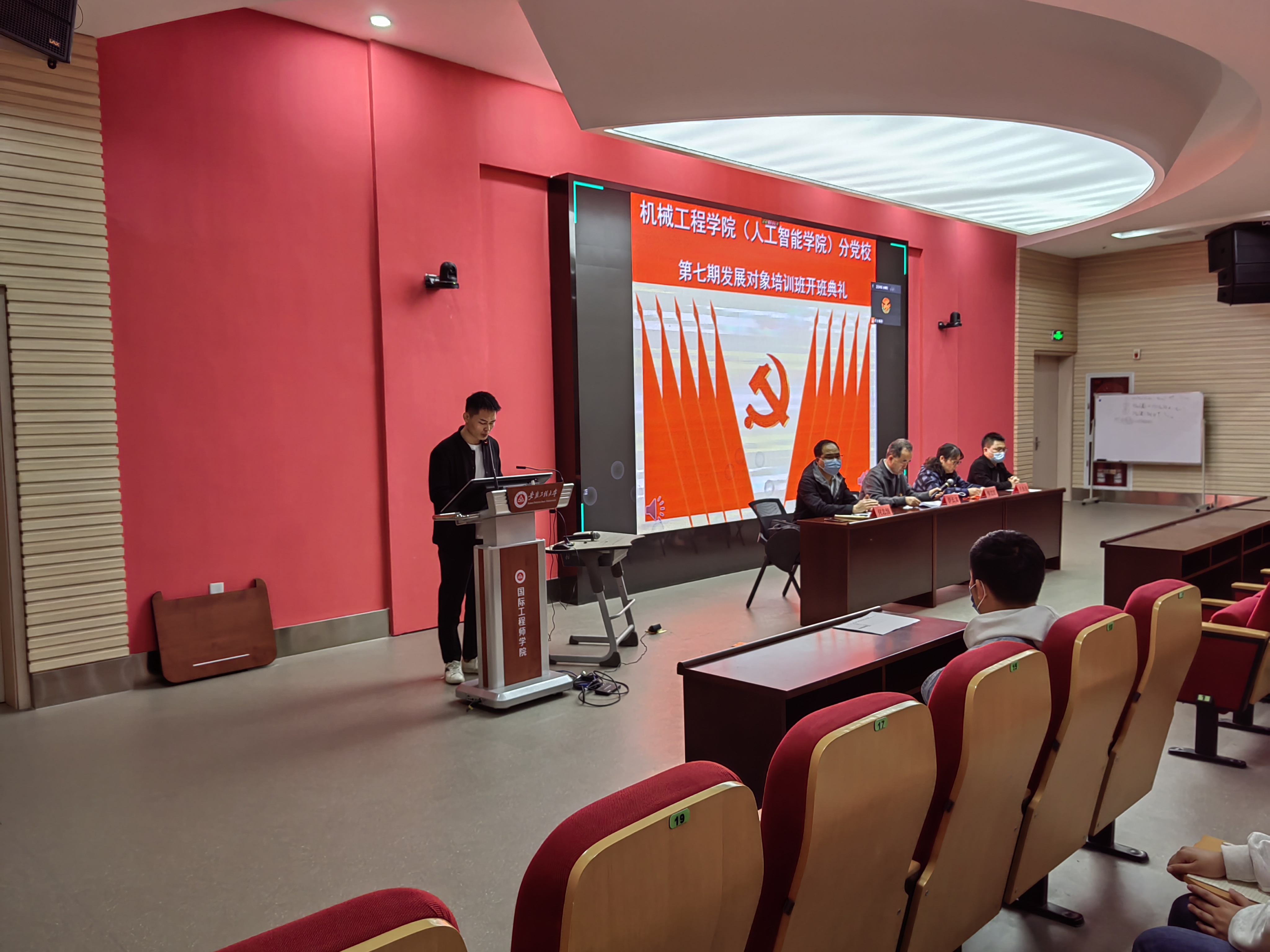 为提高党员发展对象的政治理论水平和党性修养,切实保证新发展党员质量。4月29日晚,机械工程学院(人工智能学院)在新区图文中心小报告厅举行第七期发展对象培训班开班典礼,学院党委书记伊长文,党委副书记李文江、何志恒以及相关教师、全体学员出席。会议由李文江主持。
