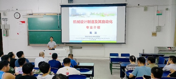 机械工程系主任王建彬主持机械设计制造及其自动化专业介绍会,疏达教授担任专业介绍人。会议分为学长致辞、新生代表发言、专业介绍三个环节。机制205班朱哲枭以学长的身份给同学们展示自己在专业方面学习中的一些研究成果;机制218班李聪灵同学讲述了自己大学收获和感悟,提出一些建议。新生向明远同学表达了自己的入学感受和未来期许。最后疏达教授的专业介绍主要从专业概况、机械工业概况、专业能力和知识结构、创新创业教育展开,内容丰富、干货满满。