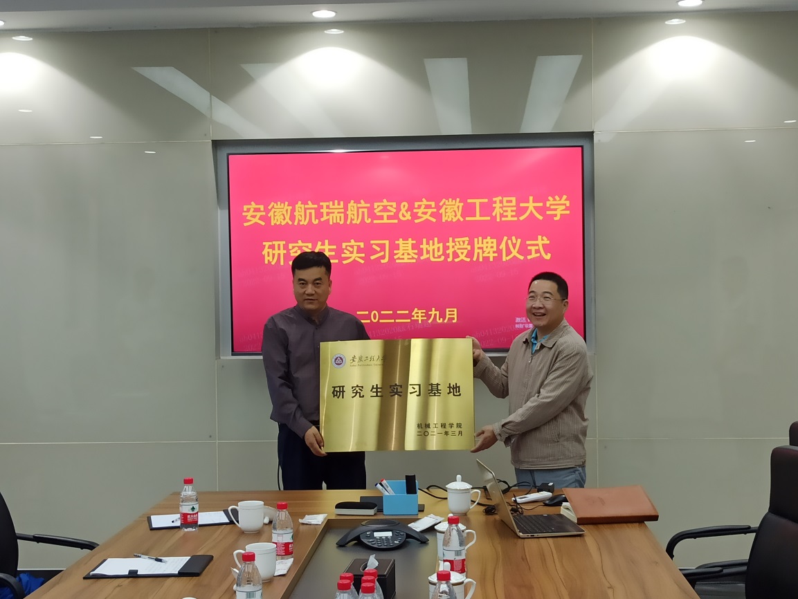 9月15日下午,机械工程学院院长王建平带队赴安徽航瑞航空动力装备有限公司参加“黑料正能量 -航瑞动力研究生实习基地”揭牌仪式。航瑞动力公司董事长朱航及研发工作人员等出席了揭牌仪式。