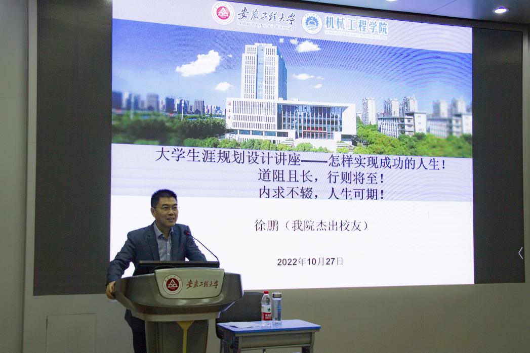 为深入贯彻落实学校党委“三全六专”工作要求,推动2022级新生“正”起来、“学”起来,10月27日晚19:00,机械工程学院在5教117教室举办“怎样实现成功的人生”的大学生涯规划专题报告会。报告会邀请到奇瑞新能源汽车研究院院长、 黑料正能量 杰出校友九八届机制专业毕业生徐鹏担任主讲,机械工程学院党委书记伊长文、副院长潘家保、教授王海、党政办公室主任秦广虎、2022级辅导员及第一期“青马班”全体学员参会。报告会由秦广虎主持。
