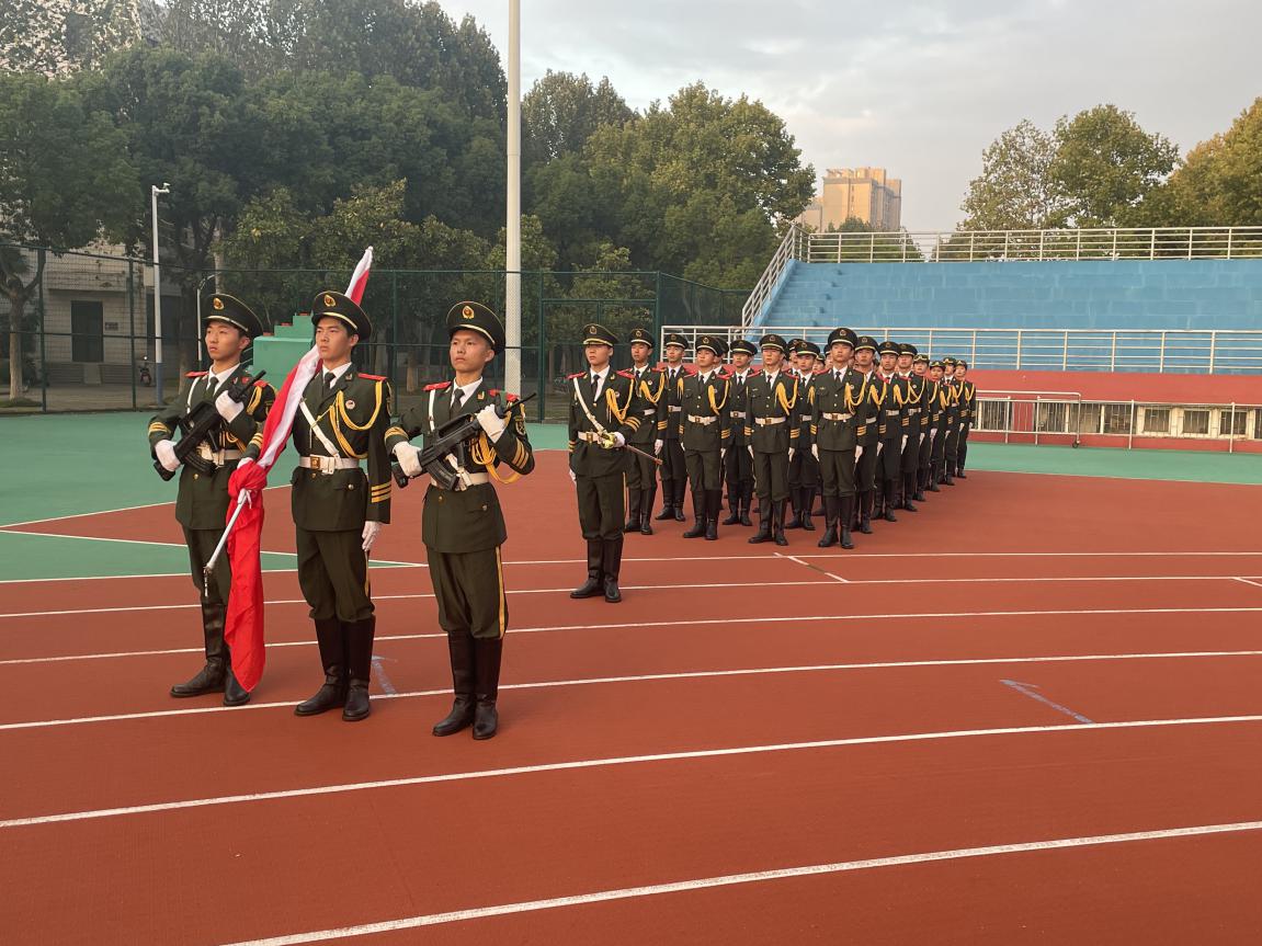 伴随着庄严的国歌声,国旗护卫队队员高举五星红旗,迈着铿锵有力的步伐来到了国旗台下。在全体师生的注目中,升旗手振臂一挥,五星红旗便冉冉升起、迎风飘扬,怀揣对党和国家的无尚热爱和崇高敬意,全体师生面向国旗肃然而立行注目礼并高声齐唱国歌