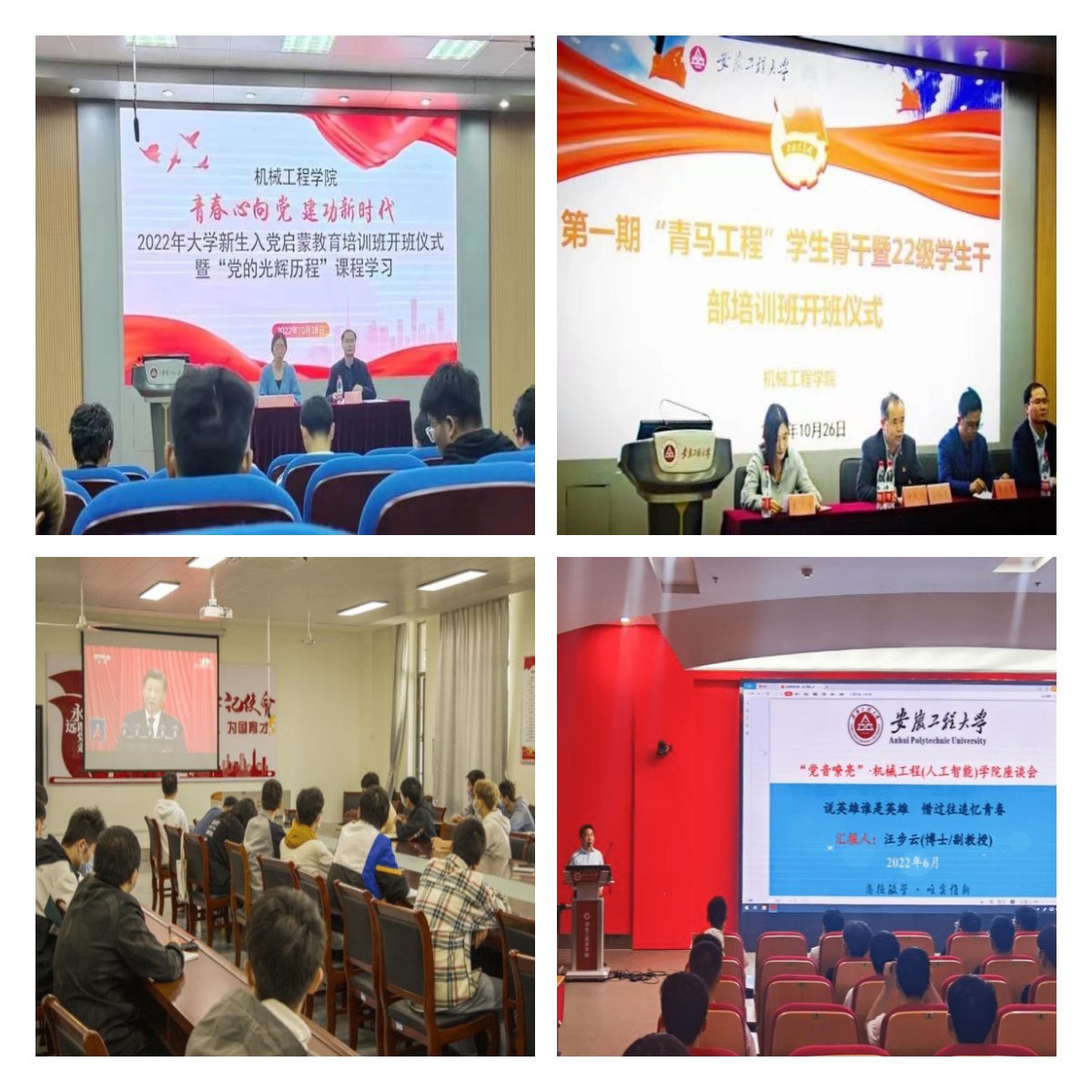 强化“正”引领,筑牢思想根基,坚持做好青年学子的引路人。重点围绕基层党支部创优争先、思政体系建设、党团学一体化建设、网络新媒体平台建设、党员师生先锋作用发挥等采取推进措施。强思想引领,重理论武装,开办“入党启蒙教育”培训班、各类分党校培训班、“青马工程”培训班、党员集中学习培训班,培训近2000人次,提交入党申请书1366人;组织开展集中收看党的二十大开幕会、“学习宣传贯彻党的二十大 我为申博做贡献”“强国有我请党放心”“喜迎党的二十大,奋斗新征程”“学习党的二十大 党课正开讲”等党的二十大系列主题活动;举办资助诚信教育主题活动、《学生手册》知识竞赛、“抗击疫情,党员先行”实践活动;召开第一届学生代表大会;依托学院团委微信公众号开设“青年说”“青年微榜样”“青年分享”“感‘械’研途”等系列推文栏目,强化榜样引领作用,筑牢网络新阵地;举办以“青春厚植信仰,绽放绚烂之花”“说英雄谁是英雄,昔过往追忆青春”为主题的“党音嘹亮”大讲堂品牌讲座2场;邀请离退休老教师赵国庆做“十万里红色骑行 学党史致敬经典”专题报告。继续强化研究生工作室“红色读书角”建设,共同品读红色经典书籍。做到理论学习全覆盖、政策宣传全覆盖、行动实践全覆盖。机械182李增产荣获“中国大学生自强之星”奖学金,机制205朱哲枭荣获2022年安徽省大学生年度人物提名荣誉称号,机电201张晨荣获“外研社·国才杯”全国英语演讲、阅读、写作大赛(安徽赛区)一等奖,机械20级研究生杨克帆荣获省级研究生“党员标兵”荣誉称号。