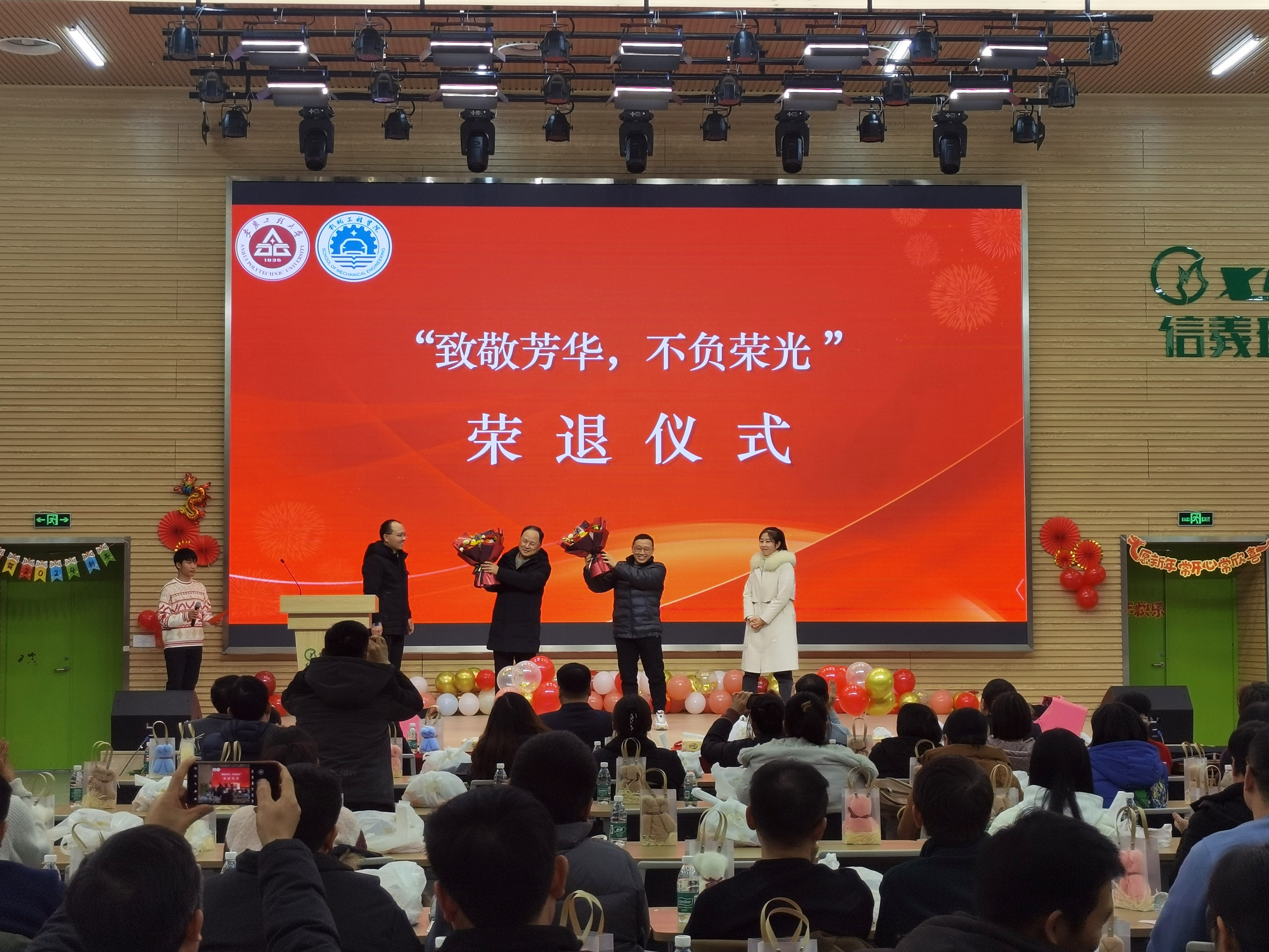 退休职工荣退仪式环节,全体教职员工向汪太平、杨明两位老师致以最崇高的敬意和最真诚的祝福,青年教师代表为他们献上了鲜花。两位退休教师纷纷表达了对学校的感激和祝福之情。