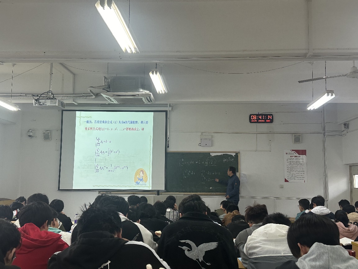 梁利东老师讲授的内容为《计算方法》课程的第五章数值积分算法,梁老师首先介绍了本章主要的课程内容,并强调数值积分算法的学习思路,然后从实际问题出发,讲解数值积分方法的必要性、求积的理论基础、数值求积算法思想以及数值求积公式的导出和改进。在教学过程中,以深入理解算法设计思想为主,并强化学生的算法应用能力,授课思路清晰,与学生有良好互动。