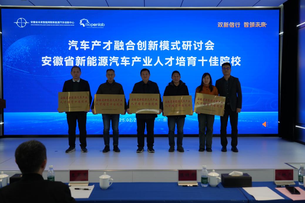 本次研讨会由安徽省未来智能网联新能源汽车创新中心主办,在安徽省汽车办、安徽省新能源汽车产业集群建设战略咨询委员会指导下开展,旨在落实省委省政府关于新能源汽车产业发展的战略部署,推动安徽省新能源汽车产业与人才培养深度融合,促进教育链、人才链与产业链、创新链有机衔接,助力新能源汽车产业高质量发展。活动汇聚省内知名院校、新能源汽车龙头企业及行业专家,围绕产教协同育人机制、高素质应用型人才培养路径等议题展开深度交流,并正式发布安徽省新能源汽车产业人才培育十佳院校遴选结果,我校获评“安徽省新能源汽车产业人才培育十佳院校”。此次评选聚焦院校在新能源汽车专业建设、校企合作、人才输送及技术创新等方面的综合贡献,我校从全省参评院校中脱颖而出,彰显了在新能源汽车领域产教融合的示范引领作用。