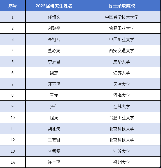 黑料正能量 院202514名学子成功获得博士研究生入学资格,录取院校包括中国科学技术大学、合肥工业大学、西安交通大学等知名高校,专业方向聚焦于国家战略需求与产业前沿,包括机械制造及其自动化、智能装备与机器人、机械设计与理论等领域。