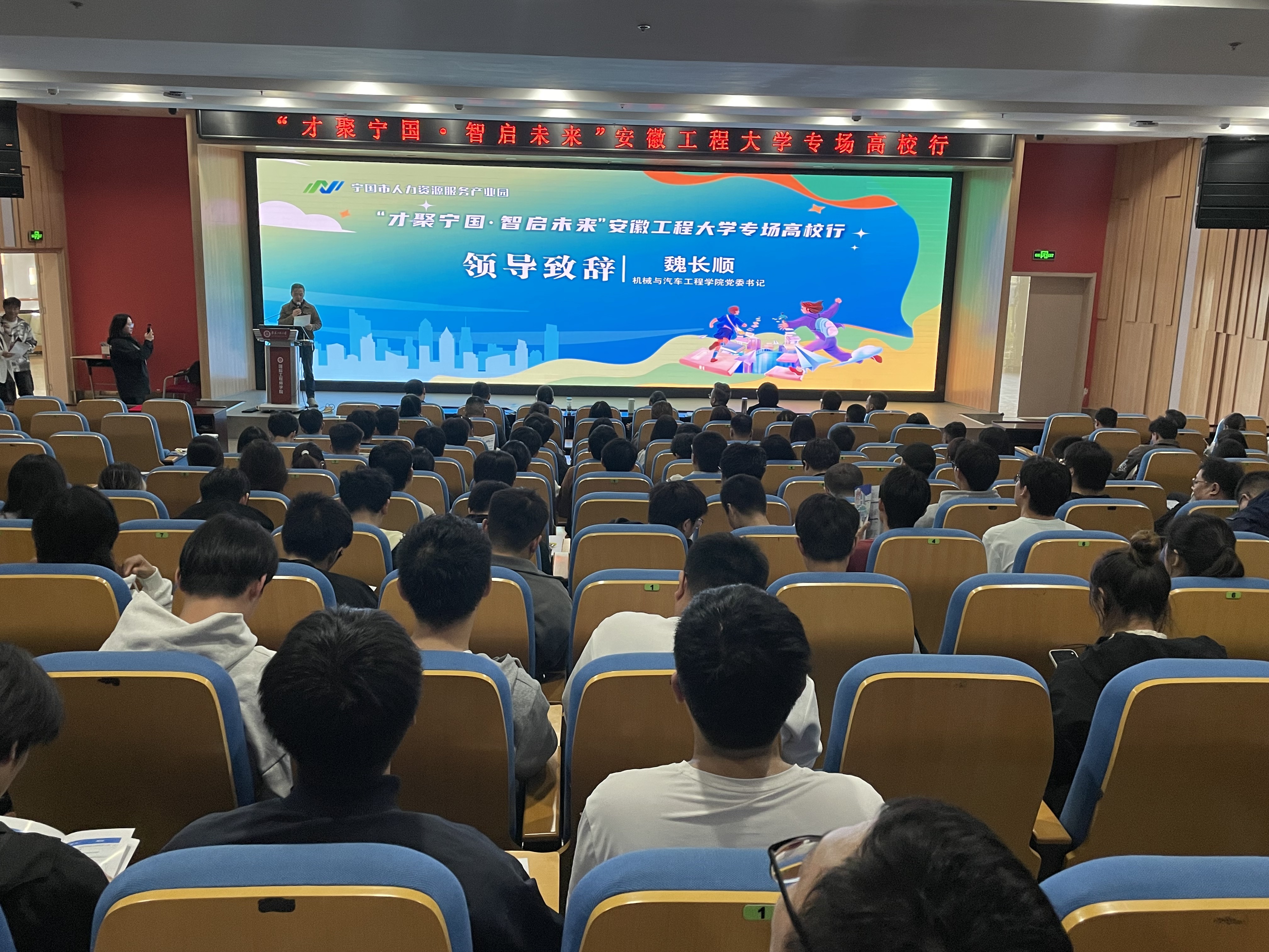 招聘活动现场,魏长顺、汪廷分别代表校方和宁国市致辞,共同表达了持续深化校地合作的愿景。随后举行了保隆、亚新科等校企合作签约仪式、宁国人才政策宣讲、“宁国青年发展品牌”宣传推介、需求岗位发布,部分参会企业还进行了专项推介。推介活动结束后,同学们前往招聘区域,在各个展位前咨询,投递简历。现场还设立了网络云聘会直播,同步展示现场招聘内容。