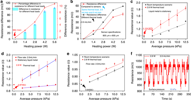 研究团队采用镓铟合金(EGaIn)作为敏感层材料,其优异的流动性和导电性使其同时承担信号传输与冷却介质双重角色。传感器内部采用蛇形微流道结构,通过外接循环泵驱动液态金属流动,将高温区域的热量迅速带离,使导电组件温度波动控制在较小范围内。实验表明,在2.8 W热负载下,液态金属以2.0 mL/min流速循环时,传感器电阻较静态工况降低38.1%,且灵敏度达0.11/kPa,最大可测压力为30kPa,该研究为高温环境下的柔性电子技术开辟了新路径。通过流体-结构-热多场耦合仿真与实验验证,团队所研制的传感器在高温环境中表现出卓越的稳定性。在热冲击测试中,液态金属循环使温升幅度显著降低,且连续加载-卸载实验中电阻响应曲线保持高度一致,循环稳定性优异。此外,传感器信噪比高达43.5 dB,确保了信号采集的准确性。