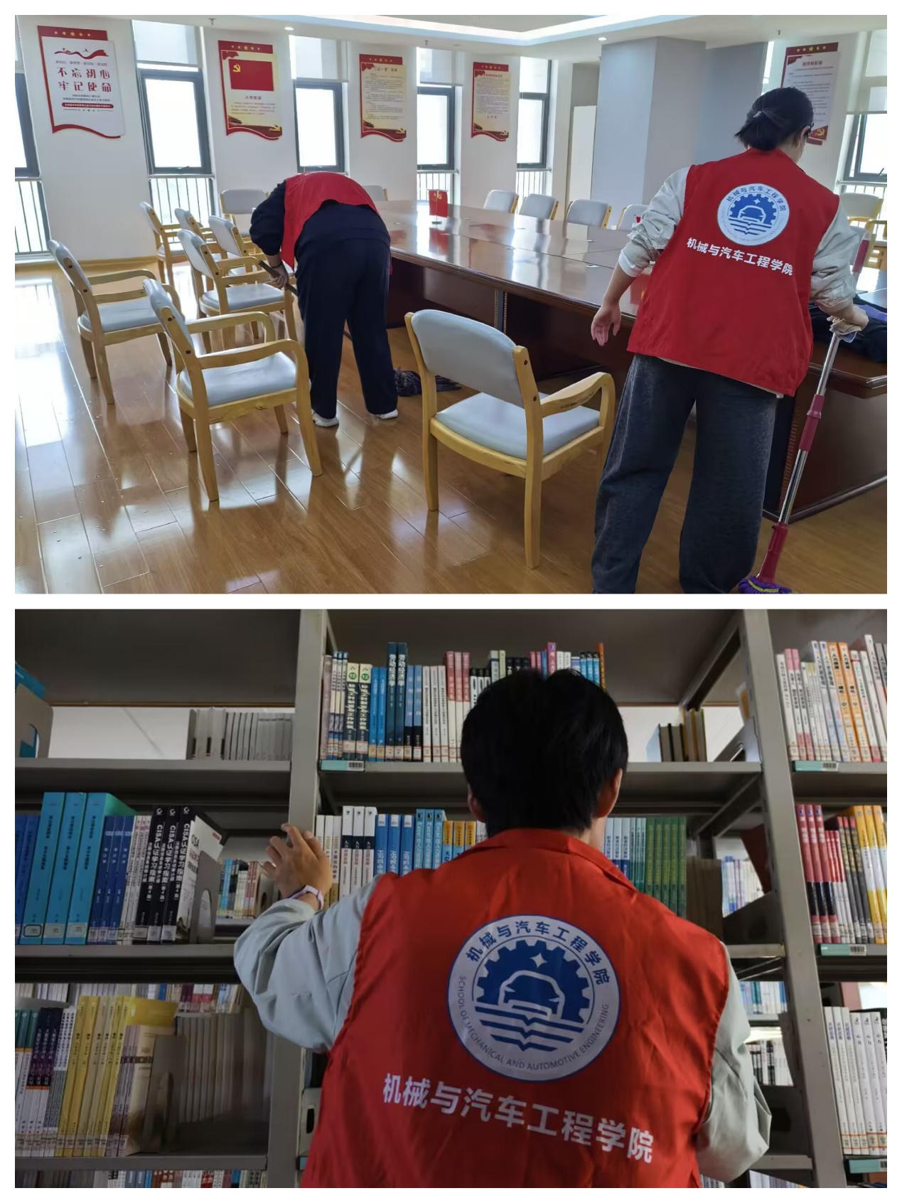 在图书馆工作人员的指导下,40名志愿者被合理分配到不同楼层和岗位,迅速进入工作状态。在图书馆老师带领下,志愿者负责会议室的深度清洁。从擦拭桌椅到地面除尘,从整理会议用品到通风换气,原本略显杂乱的会议室很快变得窗明几净、焕然一新。男生主动承担起从教学楼往图书馆8楼搬运书籍的重任。一摞摞沉甸甸的图书在他们手中接力传递,上下楼往返十余趟,汗水浸湿了衣背,但没有人喊累。