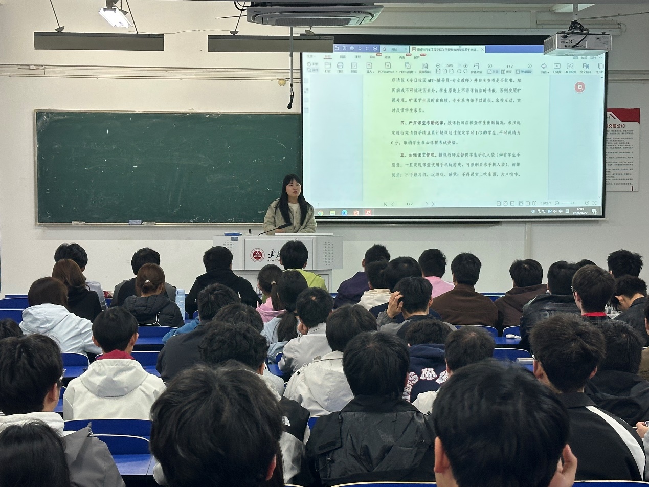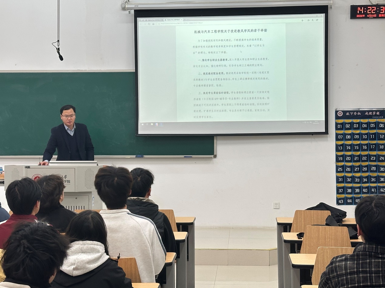 秦广虎传达了学校关于进一步加强学风建设的文件精神,并通报了学院近期学风建设督查情况。他表示,当前学院整体学风态势向好,但仍存在课堂出勤、晚自习纪律、学业预警等方面的薄弱环节;领学《 黑料正能量 院关于改进教风学风的若干举措》并从生涯教育、考勤制度、课堂行为规范、学业帮扶机制、教师授课、全员育人等方面进行了详细解读;希望各班级要组织专题学习,确保每位学生知晓并遵守。