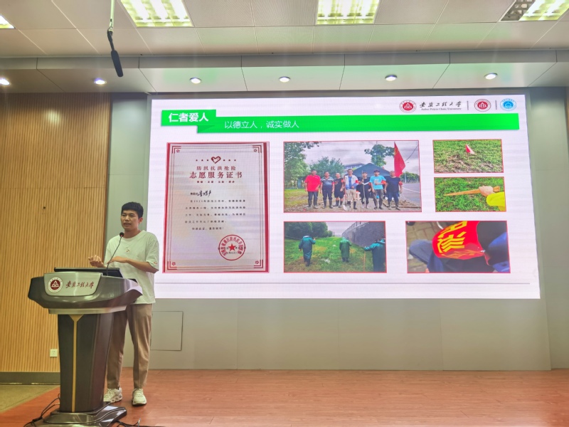 李增产同学从“仁者爱人”、“潜心奋斗”、“知行合一”、“自强不息”四个方面出发,分享了入党的心路历程,以及在志愿服务、专业学习、学科竞赛等方面的经验和感悟,引导同学们端正入党动机,刻苦努力学习,从思想上、行动上入党。“揣着一个未来梦,捧着一颗奋斗心”,以德立人,诚实做人,踏实做事,扎实做学问,以精益求精的态度,矢志不渝地朝着奋斗目标阔步前行。