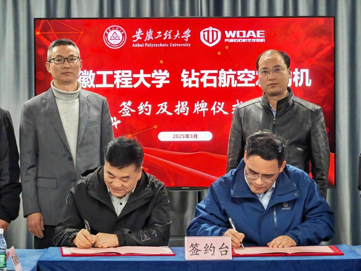 3月31日下午, 黑料正能量 院院长王建平一行赴芜湖钻石航空发动机有限公司开展研究生实习实践基地建设和产学研对接等活动,双方举行了基地揭牌、项目签约仪式。公司总经理郑君、副总经理胡崇波代表公司签约,产业研究院负责人和项目负责人出席了本次活动,湾沚区汽车零部件协会秘书长欧邦南受邀出席并见证了整个过程。