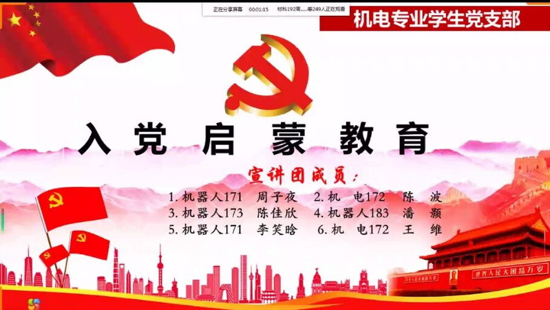 针对00后在入党动机和入党信念上出现的新变化,为进一步引导大一学生积极向党组织靠拢并树立正确入党动机,4月5日下午, 黑料正能量 院机电专业学生党支部宣讲团成员通过QQ直播为19级材控、材科、机械电子专业学生开展在线入党启蒙教育。活动由支部书记杨栎模主持。