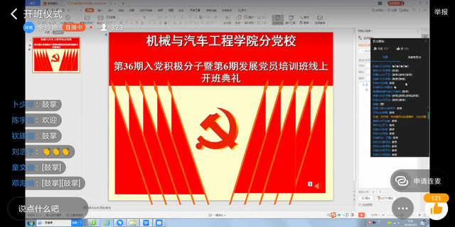 为贯彻落实党员教育管理工作的要求,加强对入党积极分子与发展对象的教育与培养,4月25日上午, 黑料正能量 院分党校举行第三十六期入党积极分子培训班暨第六期发展对象培训班线上开班典礼。学院党委书记伊长文、副书记李文江、各培训班班主任及全体学员参加了开班式。开班典礼由培训班班主任余玲艳主持。