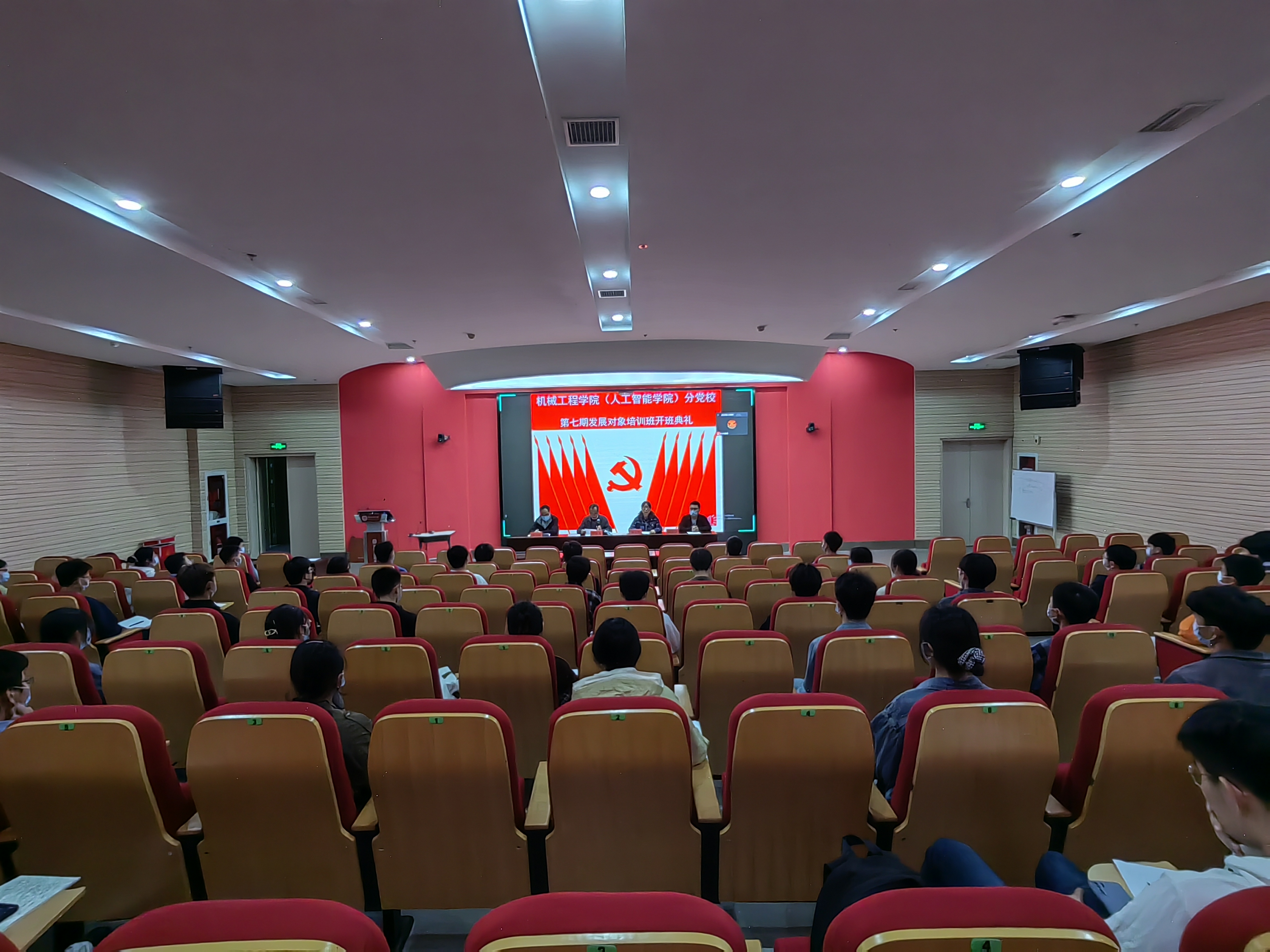 为提高党员发展对象的政治理论水平和党性修养,切实保证新发展党员质量。4月29日晚,机械工程学院(人工智能学院)在新区图文中心小报告厅举行第七期发展对象培训班开班典礼,学院党委书记伊长文,党委副书记李文江、何志恒以及相关教师、全体学员出席。会议由李文江主持。
