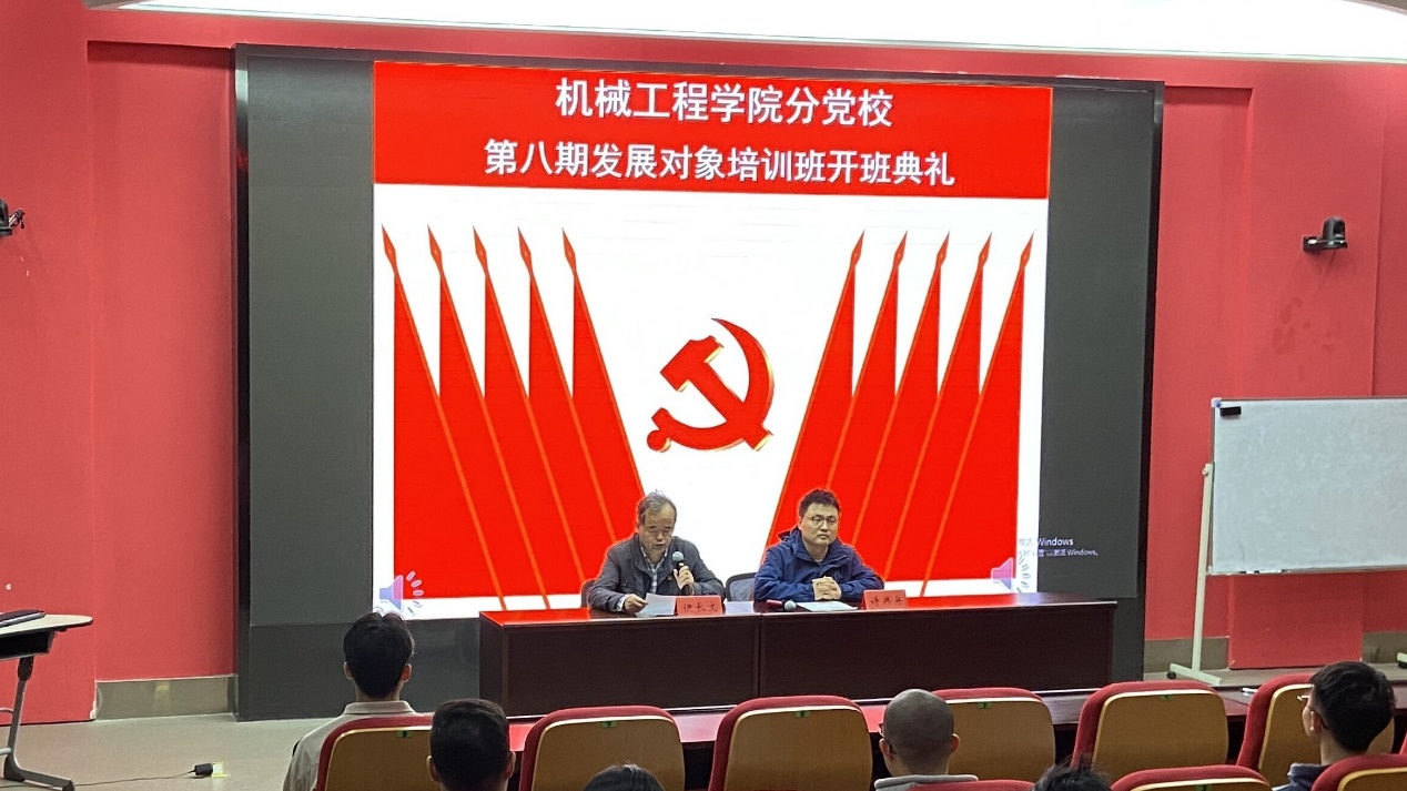为提高党员发展对象的政治理论水平和党性修养,切实保证新发展党员质量。11月14日晚,机械工程学院在国际工程师校区图文中心小报告厅举行第八期发展对象培训班开班典礼,学院党委书记伊长文,培训班班主任许典舟和全体学员出席。典礼由许典舟主持。
