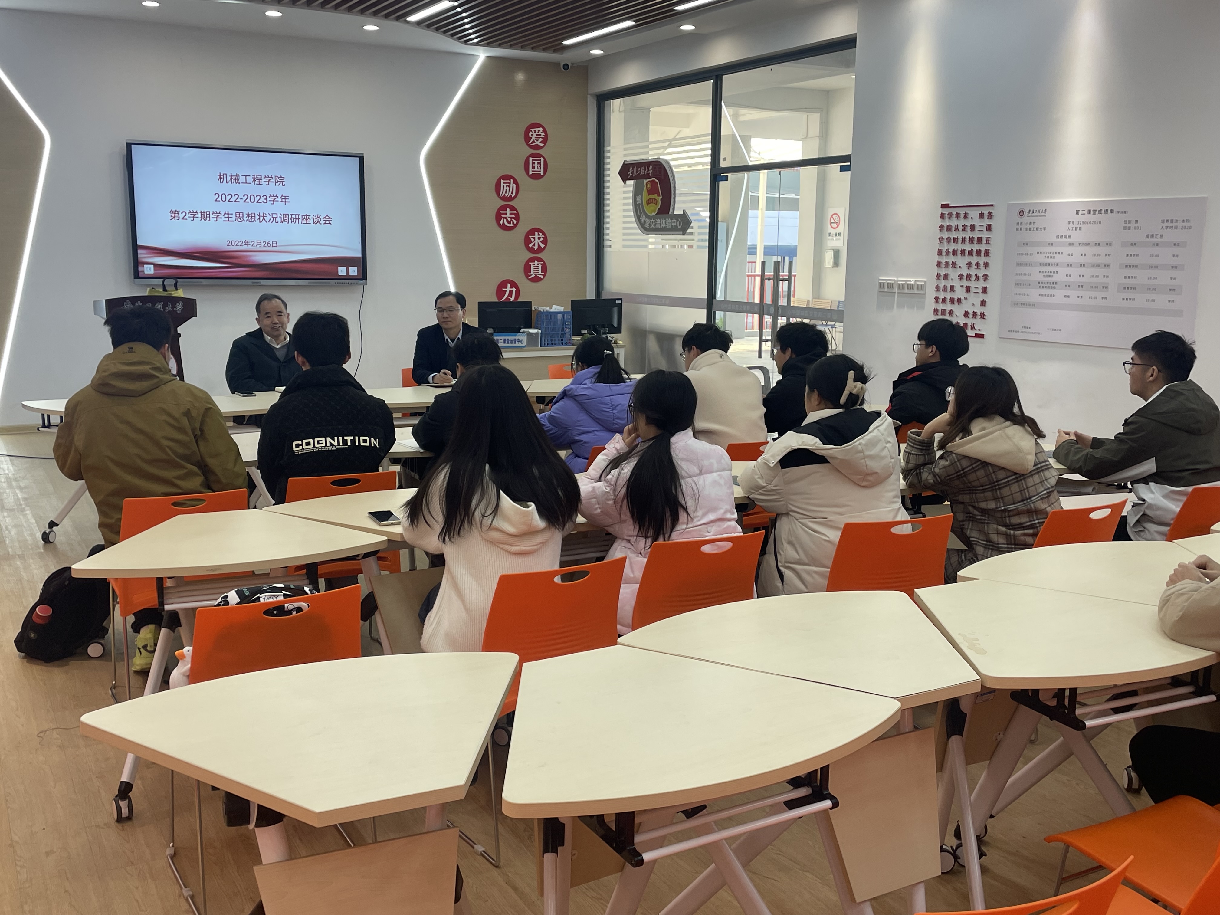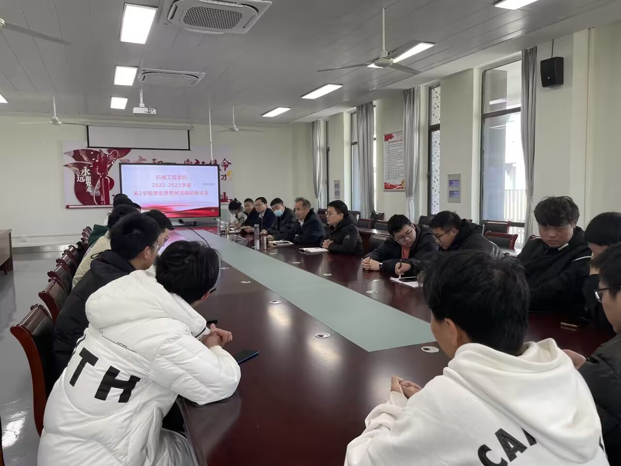 为深入了解新学期学生思想动态,不断推进“三全六专”育人工作,2月26日,机械工程学院组织召开新学期学生思想动态调研座谈会,学院党政领导班子成员、相关辅导员老师、各年级本科生及研究生代表参会。座谈会分别由秦广虎、潘家保两位老师主持。