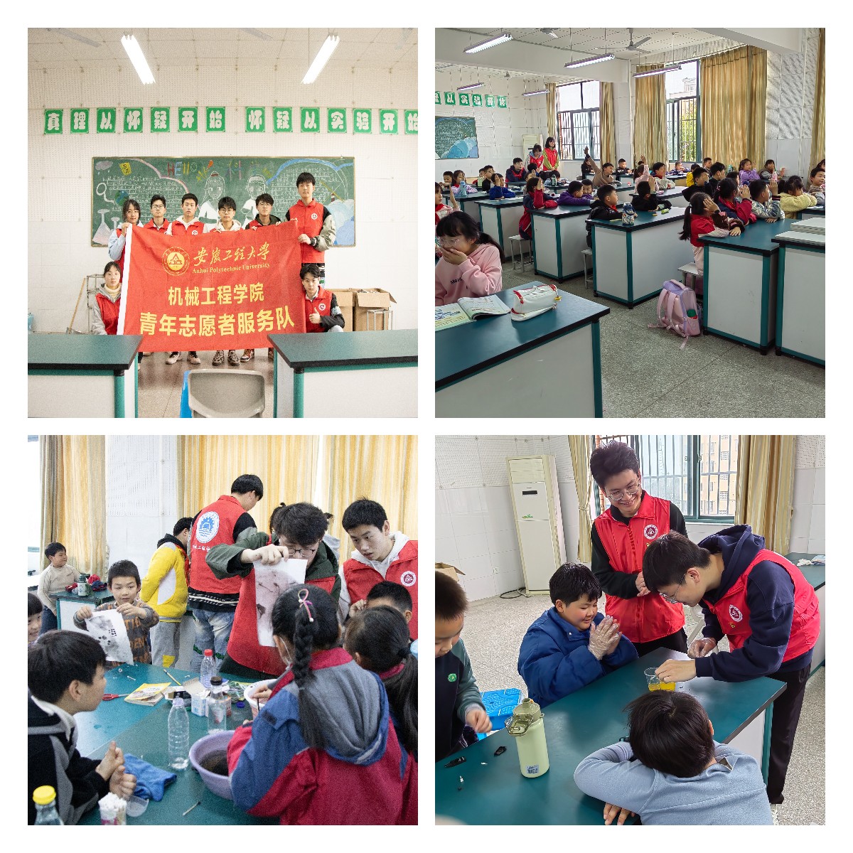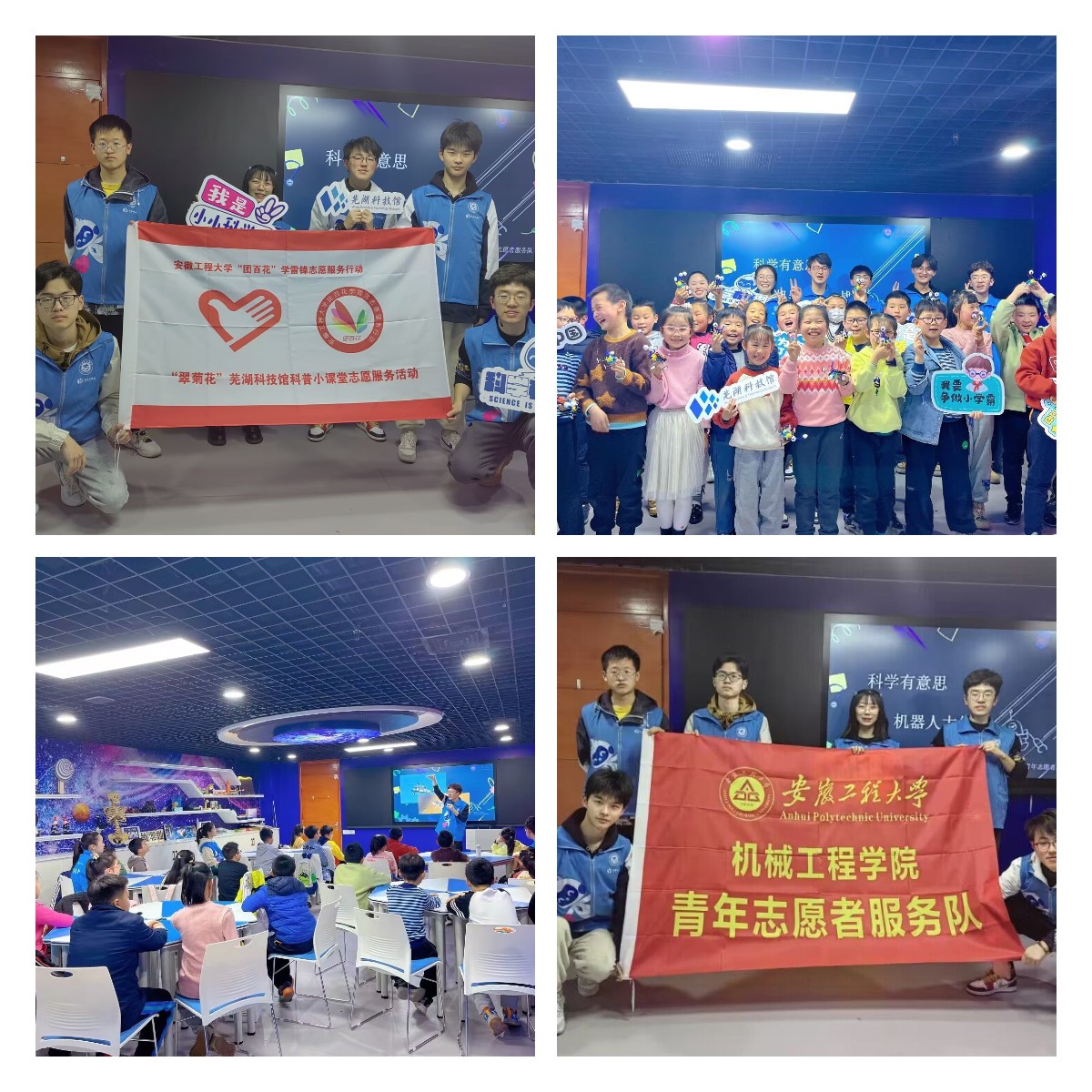 翠菊花——推动科技传播。志愿者们三次走进芜湖市科技馆,面向前来参观的小朋友们科普仿生技术的原理及应用相关知识,并以爬虫机器人为例引导他们来正确地拼装机器人,以充分展现科技的风采与魅力。为了确保游客们拥有高质量的参观体验,志愿者们还参与到科技展厅的维护工作中来。