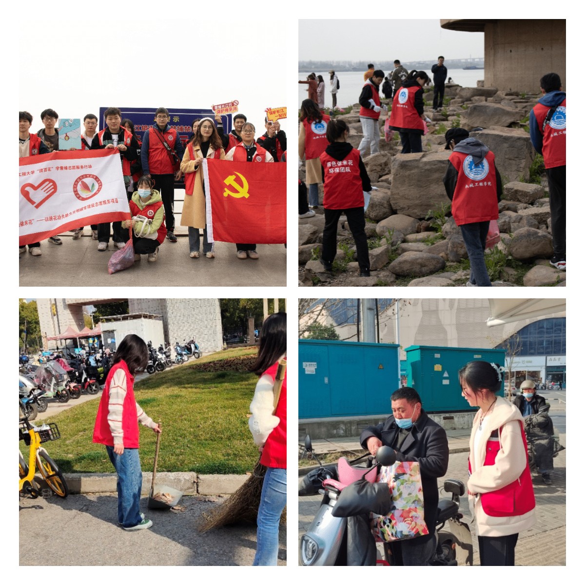 四色依米花——助力文明城市。志愿者们走进芜湖市内、长江边上,开展了“认领干净路段”、“在水一方”长江净滩主题活动。活动内容包括清扫路面、捡拾垃圾、垃圾分类、倡导安全出行、宣传环保知识、普及禁渔法律法规、呼吁大家关注生态环境等,旨在以绣花功夫助力文明城市建设。