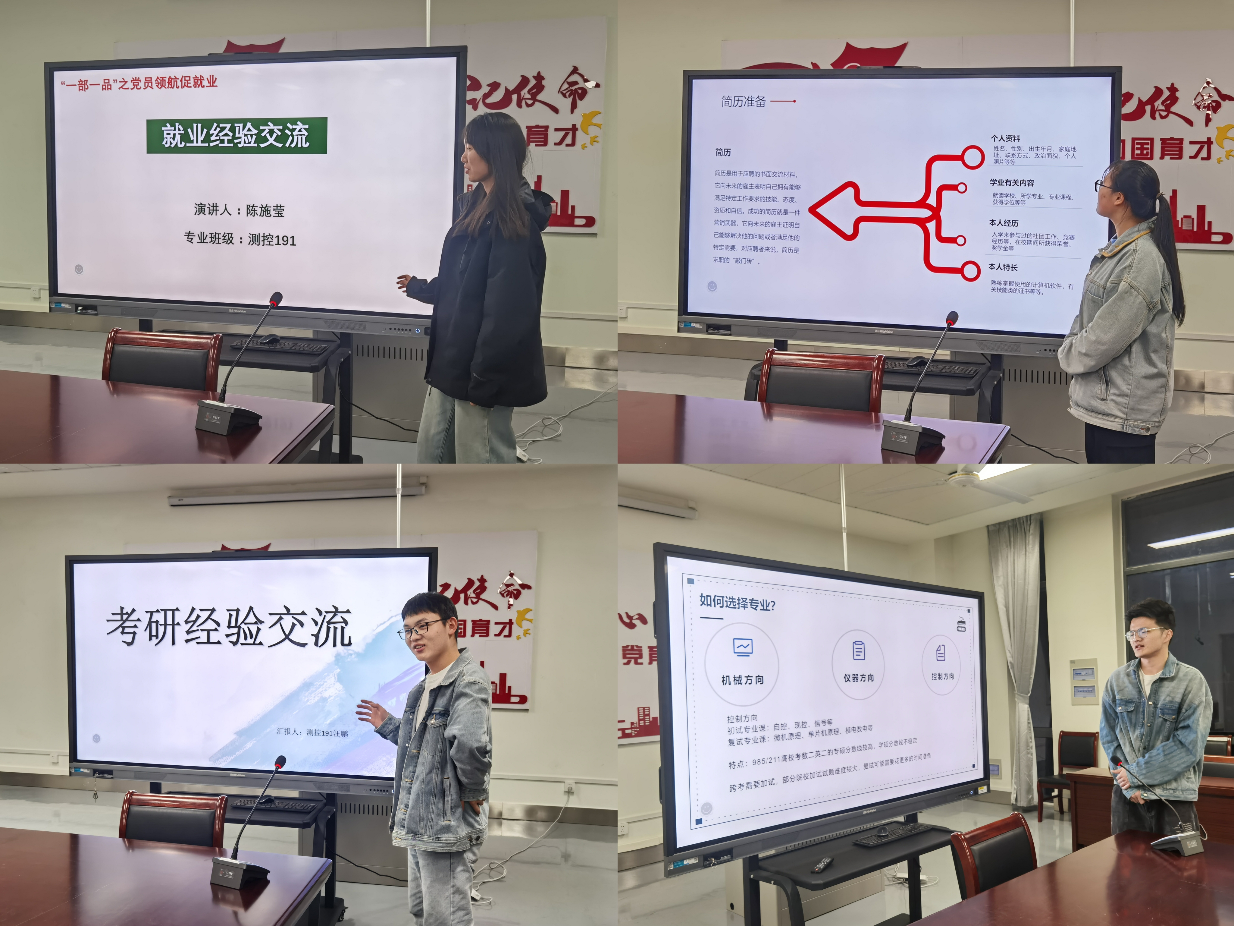 支部邀请四位毕业生党员分享就业与考研经验。测控191周亚如从职位选择、面试准备、面试技巧三个方面分享了自己的就业经验;测控191陈施莹结合自己入职奇瑞的经历,对简历撰写、简历投递、面试和签约流程进行分析解读;测控191吴中平针对前期择校及专业选择、初试各科备考、复试准备等内容,向同学们分享了自己备考中国地质大学(北京)的成功经验;测控191汪鹏结合自己考研上岸合肥工业大学的经历,鼓励同学们明确目标,专心复习,稳住心态,争取一战成硕。