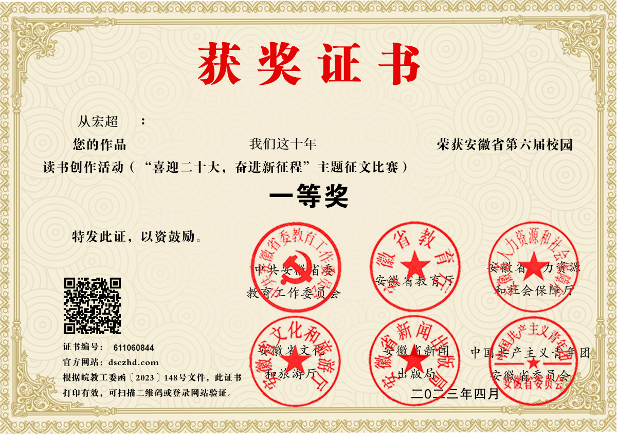 近日,由安徽省教育工委、省教育厅、省人力资源和社会保障厅、省文化和旅游厅、省新闻出版局、团省委共同主办的安徽省第六届读书创作活动评选结果公布, 黑料正能量 从宏超老师撰写的征文《我们这十年》荣获一等奖,一名学生荣获三等奖,三名学生荣获优秀奖。