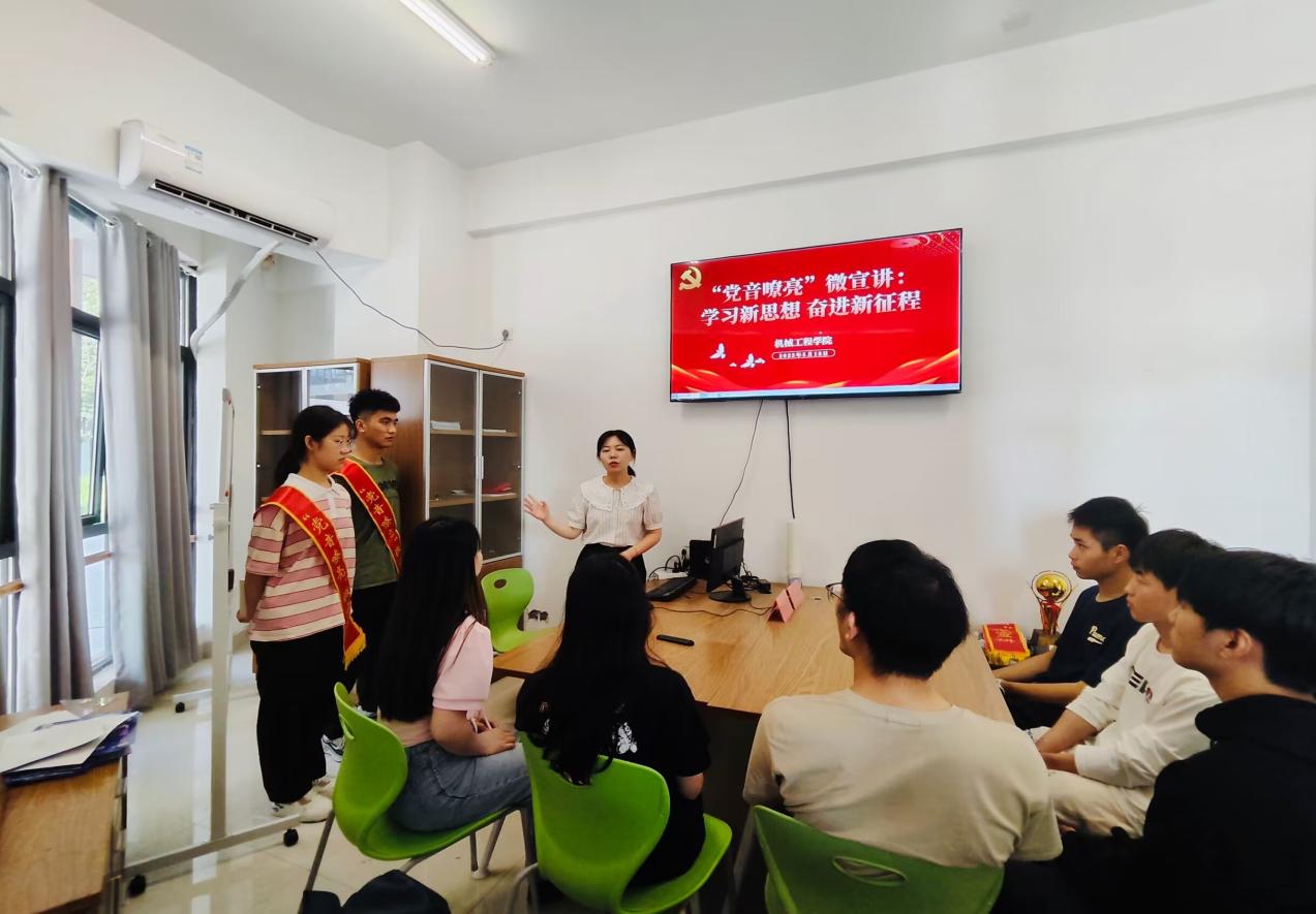 为深入开展学习贯彻习近平新时代中国特色社会主义思想主题教育工作,全力推进主题教育往深里走、往实里走、往心里走,推动青年学生“正起来”。5月18日,机械工程学院本科生学生党支部在学生书院“党音嘹亮”工作室联合开展“学习新思想,奋进新征程”主题微宣讲活动,各党支部书记、学生党员及发展对象参与活动。