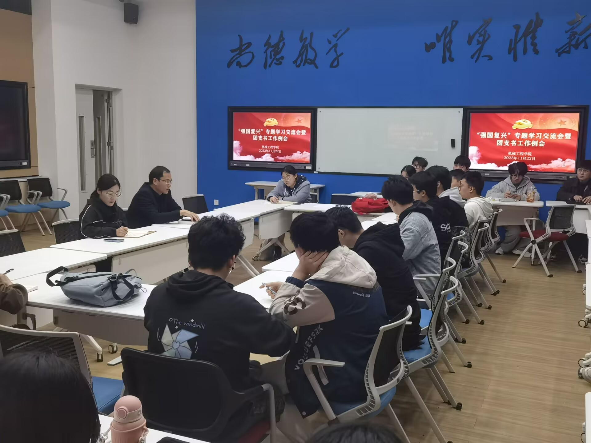 为强化团学队伍建设,做深做实“三全六专”育人实践,更好地推进团员和青年主题教育,11月22日,机械工程学院在国际工程师学院校区X101召开了“强国复兴”专题学习交流会暨团支书工作例会。学院党委副书记秦广虎、团委副书记王海燕、团委学生副书记曾令帅、团学干部代表及新校区全体团支书参加会议。