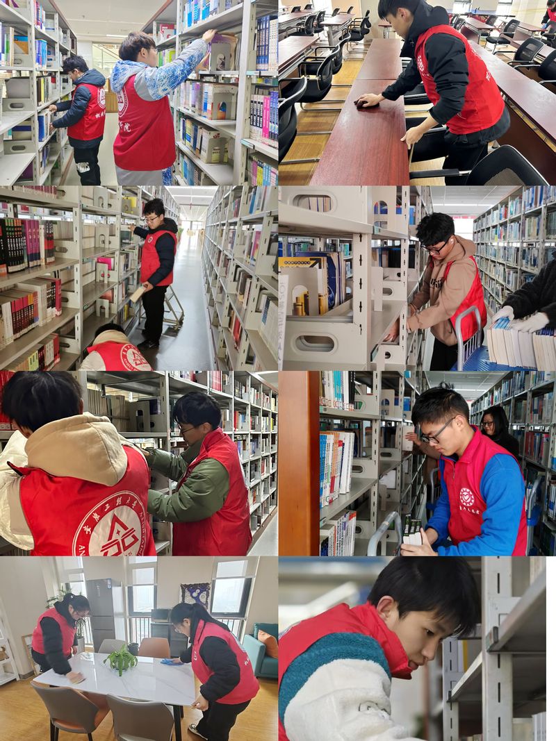 活动当天,来自学院不同年级的24名志愿者准时在老校区图书馆门口集合,在工作人员的指引下,他们分组前往图书馆的不同楼层,有序开展着打扫卫生和书籍整理工作,他们各司其职、认真负责,从扫地、拖地、擦桌椅到摆放书籍、整理书架,忙的不亦乐乎,经过2个小时的努力,图书馆逐渐变得明亮起来。通过此次活动,团队成员切身体会到了劳动带来的成就感与满足感,他们的表现也得到了图书馆工作人员的高度肯定。