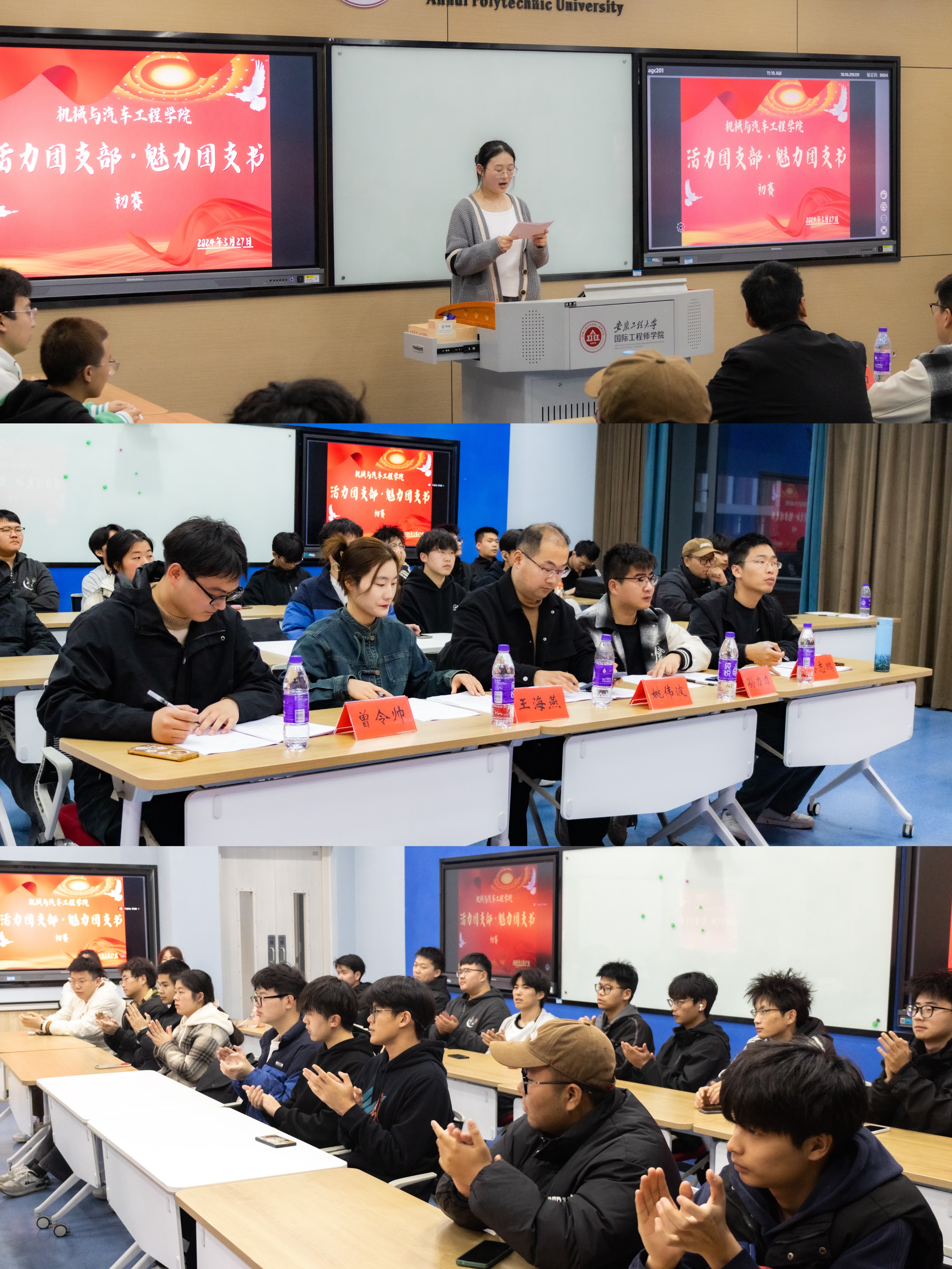 活动前期,学院团委精心策划、认真筹备,通过团支书例会、主题班会等多渠道动员,共吸引了9个团支部参加评选。活动现场,参赛各团支部重点围绕思想引领、组织建设、服务同学、社会实践等方面展开讲述,充分展示了支部建设的风采及团支书的个人魅力,将青春活力、积极向上的精神面貌完美呈现在每一个观众面前。经评选,机制222团支部获得一等奖,车辆224团支部、交通221团支部获得二等奖,机制226团支部、车辆222团支部、机电222团支部获得三等奖,机制222钱荘荘等6名团支书获得“魅力团支书”荣誉称号。