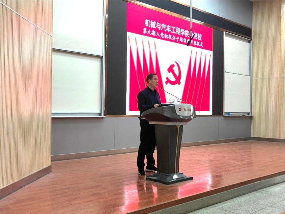为深入贯彻落实新时代党的建设总要求和新时代党的组织路线,把好发展党员“入口关”,切实提升入党积极分子思想政治理论素养,4月13日,机械与汽车工程学院第九期入党积极分子培训班开班仪式在校本部2J报告厅举行。学院党委书记魏长顺、分党校培训班班主任许典舟、孙志鹏老师及全体培训班学员参加了本次活动。开班仪式由孙志鹏主持。