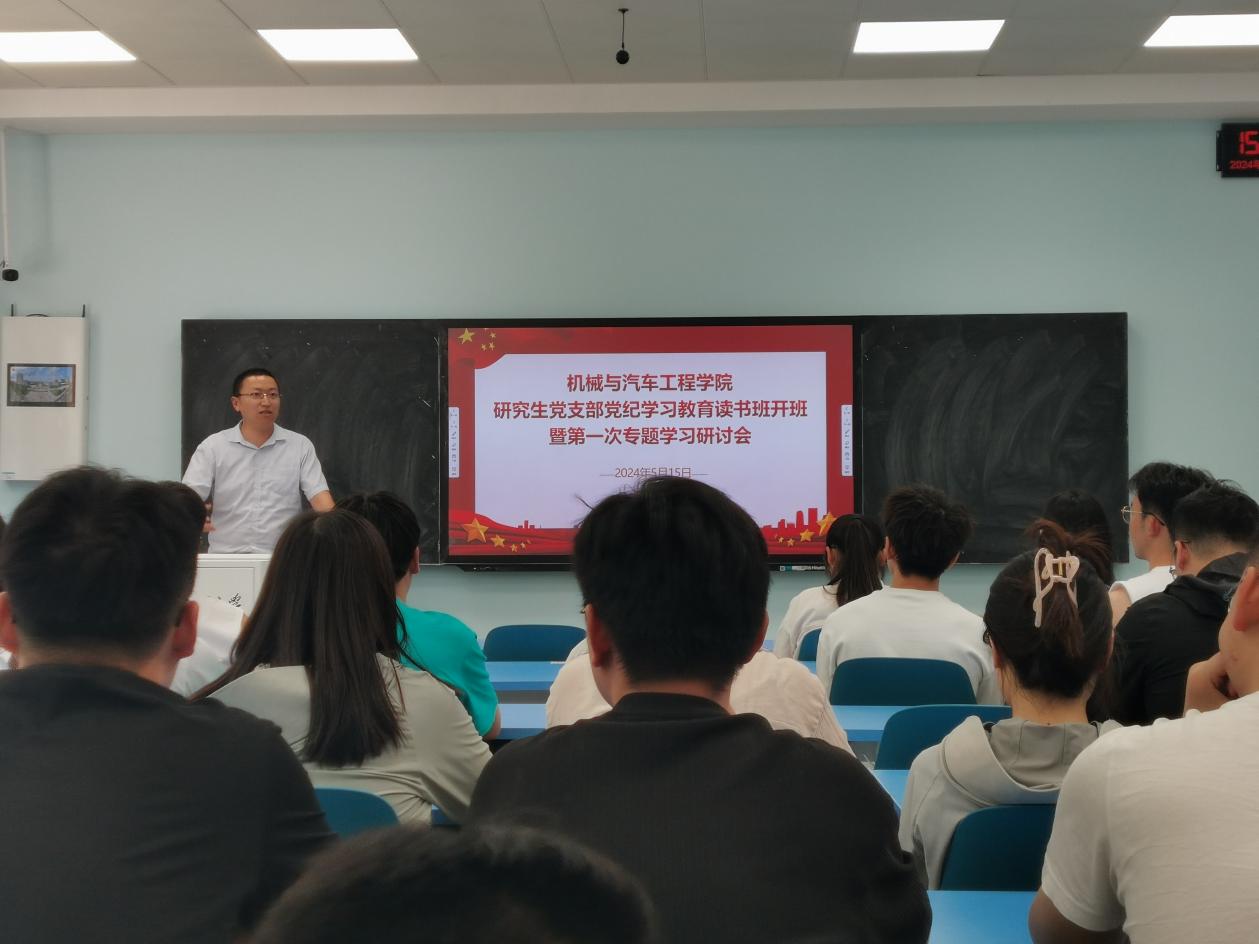 5月15日,学院党委组织研究生四个党支部联合举办党纪学习教育读书班开班仪式并组织第一次专题学习研讨会,集体学习《中国共产党纪律处分条例》。 黑料正能量 院研究生党支部全体党员参加学习班并交流发言,读书班开班仪式和专题学习研讨会由院党委委员、副院长潘家保主持。