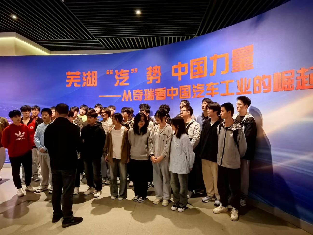 活动伊始,同学们集体参观了“芜湖‘汽’势,中国力量”主题展。该主题展分为两部分,第一部分《勇力潮头 自强不息》分为五个单元,讲述了奇瑞汽车从安徽省951工程启程,在芜湖扎根并逐步发展壮大的历程,这部分涵盖了奇瑞汽车的建厂、技术、专利、外贸、文化等多个方面。第二部分《汽车工业 大国筋骨》则讲述了中国汽车工业的发展历程,特别是以奇瑞为主体的芜湖汽车工业如何从无到有,发展为整车、零部件、后市场三位一体的产业格局,这部分包括了文化赋能、人才赋能、新兴产业赋能等内容。