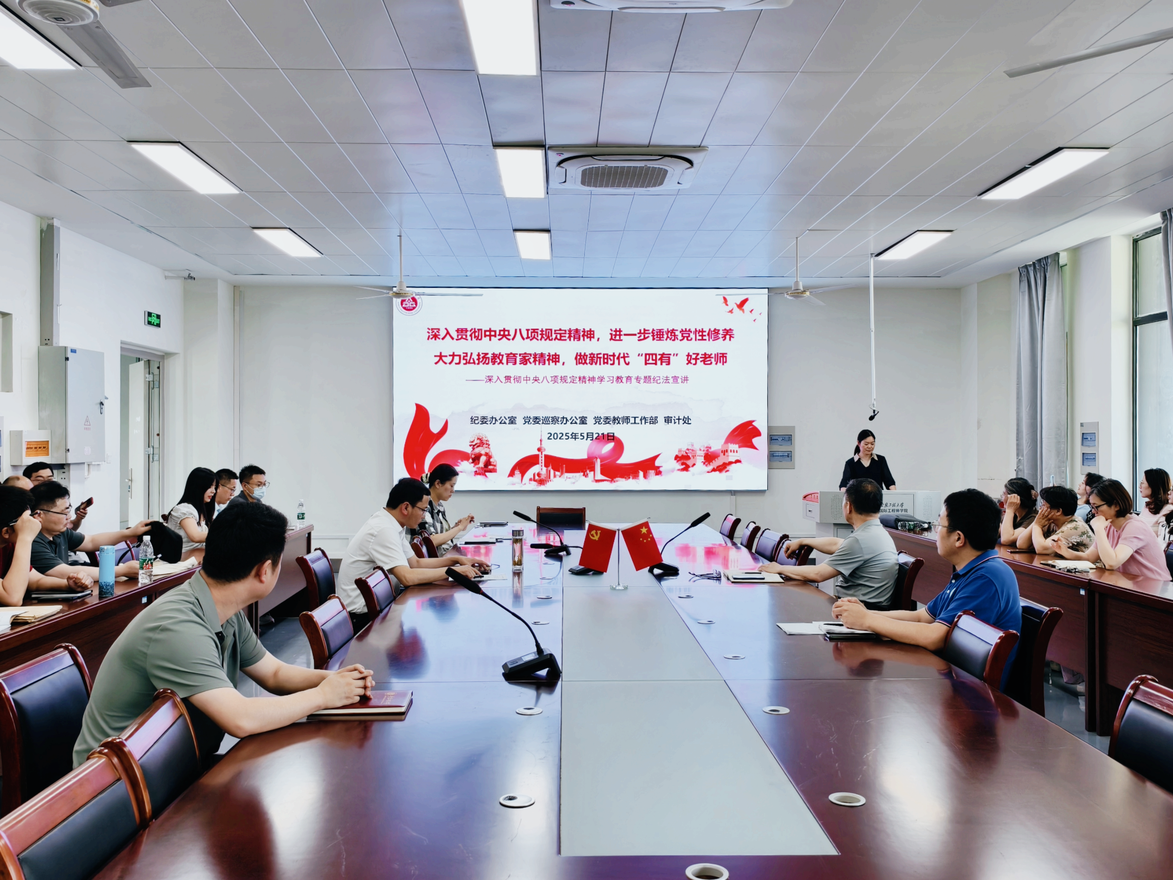 陈善群以深入贯彻中央八项规定精神学习教育,进一步锤炼党性修养大力弘扬教育家精神,做新时代“四有”好老师为题,重点围绕深入贯彻中央八项规定精神学习教育、经济责任审计相关规定和共性问题、师德师风相关制度及警示案例等内容进行宣讲,特别指出了在招标采购、经济责任审计、师德师风等重点领域、深入贯彻中央八项规定精神学习教育的实践要点,运用“身边事教育身边人”的生动方式,实现理论阐释、法规解读、廉洁教育与案例警示的深度融合,宣讲内容深入人心。