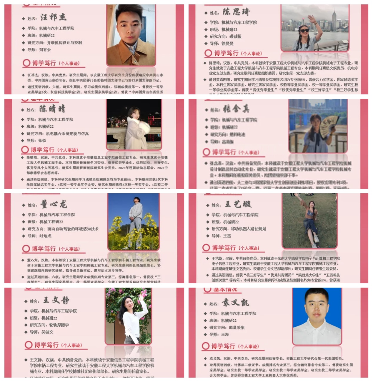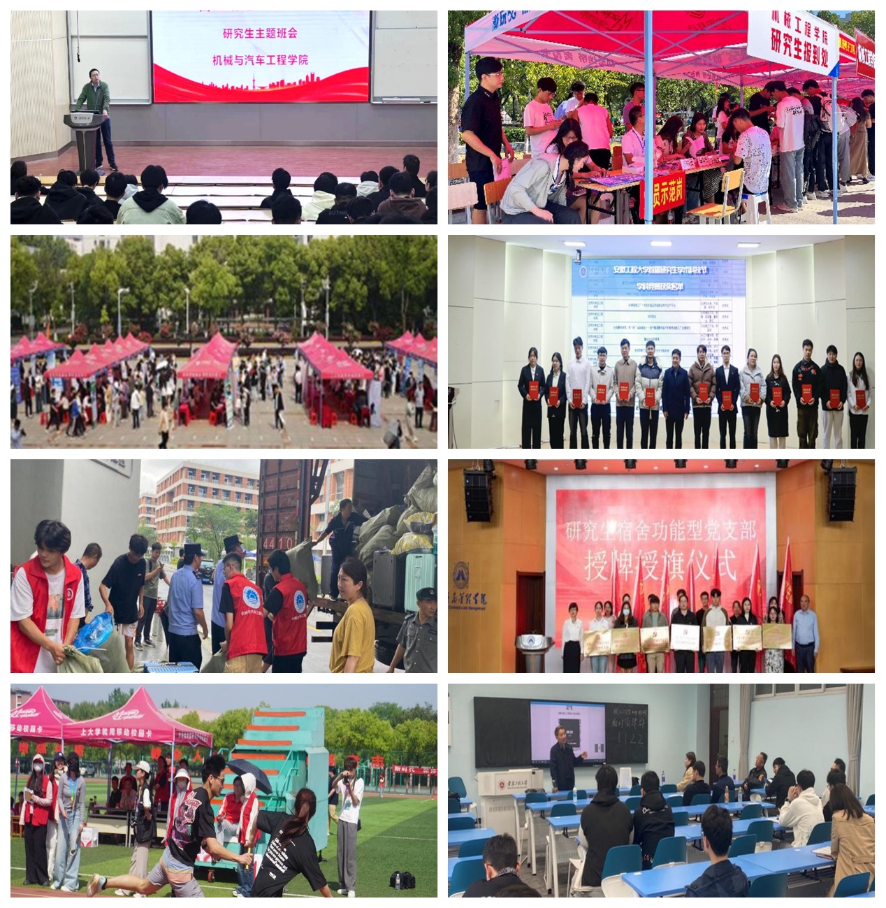 支部探索搭建科研竞赛平台、志愿服务平台、就业帮扶平台,以研促学,发挥科研育人功能,构建“专业内涵型”育人平台,促进党员全面发展;以赛促学,通过各类学术科技竞赛,构建“创新创业”育人平台,提高学生创新意识,提升学生创业能力;以练促学,拓展专业实践育人平台,实现课上和课下、理论与实践的衔接,提高学生专业素质;党建带团建,开展大手拉小手,与本科生党支部开展共建,研究生带动本科生专业科研与学科竞赛。支部重视硕士毕业生升学工作,通过“梦溪讲堂”特色学术交流平台,邀请国内外知名学者、专家开展学术讲座,营造积极向上的学术氛围;通过博士点立项、安徽省应用型高峰培育学科、省重点实验室等学科、科研平台的建设,不断改善科研条件;研究生党员立足汽车领域提升专业素养,与芜湖市加快打造万亿级汽车产业集群高度契合,响应学校“以工为主、支撑产业、服务地方”的办学特色和机械工程学科“扎根产业沃土、服务产业发展”的特色与优势。