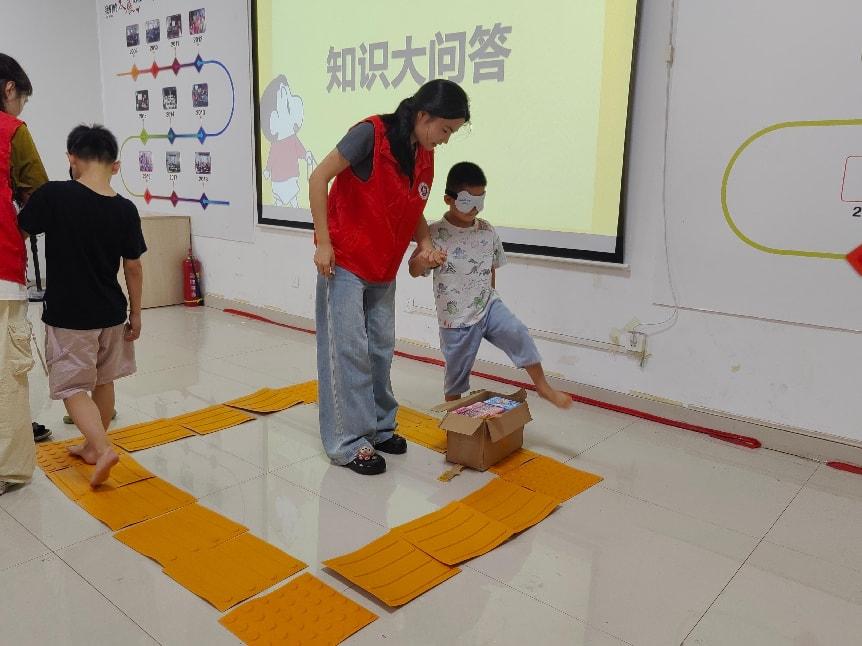 “盲道上的凸起纹路有什么用?”“为什么不能在盲道上堆放杂物?”在基本知识讲解后,志愿者进行了趣味问答,用生动的语言讲解盲道作为视障人士“出行之眼”的重要功能。特别设计的“纸条抽题”环节,让孩子们在随机互动中加深记忆,现场笑声与抢答声交织。