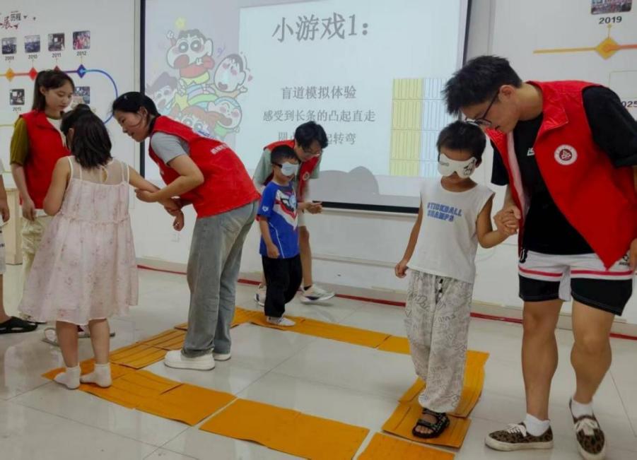 最令人印象深刻的是盲道模拟体验环节。孩子们戴上眼罩,在志愿者的引导下踏上模拟盲道,而“突如其来”的障碍物更是让他们真切感受到视障人士出行的不易。“原来盲道对他们来说,就像黑暗中的灯塔!”一位小朋友摘下眼罩后认真说道。此刻,孩子们眼中的盲道不再是普通的路面,而是充满温度的“安全通道”。
