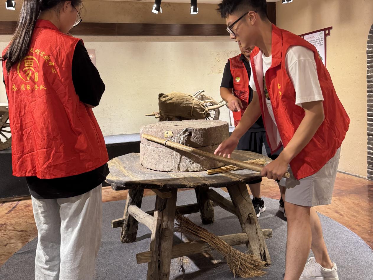 为了更深入地感受民俗文化的魅力,团队成员们积极参与了馆内的互动体验项目。民俗馆拉磨实践体验是让参与者通过亲手操作传统石磨,感受旧时粮食加工方式的互动项目,核心是体验“人力转化为食物”的传统生活智慧。同学们脸上都露出了开心的笑容,深刻体会到了传统手工艺的独特魅力。