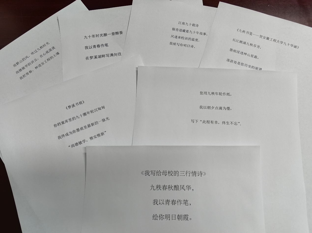 “雨耕山的风吹过九秩时光,尚德敏学的训言在心底滚烫,我把青春种进安工程的土壤”——这首出自车辆243曾文静的作品,巧妙地将祝福为诗意语言。测控241陈正泽写道:“银杏道藏着九十年故事,风递来校训的温度,我续写你明日诗。”车辆234张瑞群写道“您用九秩年轮作纸,我以朝夕点滴为墨,写下此程有幸,终生不忘。”这些诗句质朴而深刻,引发了广泛共鸣。